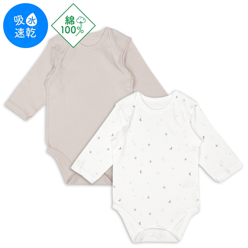 綿100%のやわらかく伸びのよいフライス編み素材に、汗をかいても乾きやすい吸水速乾機能をプラス。 衿ぐりや足口には補強テープ入り。 縫い代は外縫いで、洗濯ネームも外付けだからチクチクしません。 かぶり仕様でお着替えラクラク。 股部分はスナップボタンでおむつ替えもスムーズ。 洗い替えに便利な2枚組で、毎日の子育てをしっかりサポートします。