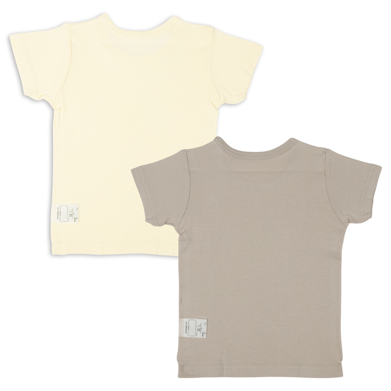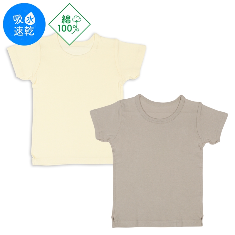 綿100%のやわらかく伸びのよいフライス編み素材に、汗をかいても乾きやすい吸水速乾機能をプラス。 衿ぐりには補強テープ入り。 袖下・脇の縫い代は外縫いで、洗濯ネームも外付けだからチクチクしません。 洗濯ネームには書いた文字が滲みにくいおなまえ欄付きで、保育園でのお着替えにも便利です。 洗い替えに便利な2枚組で、毎日の子育てをしっかりサポートします。