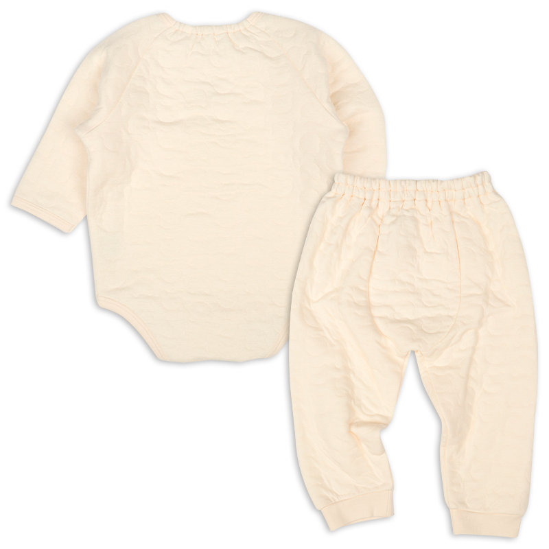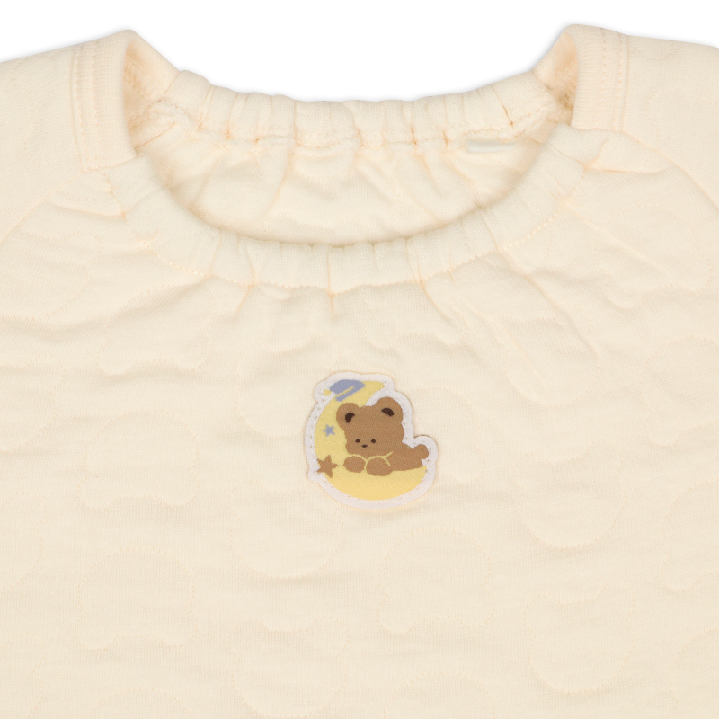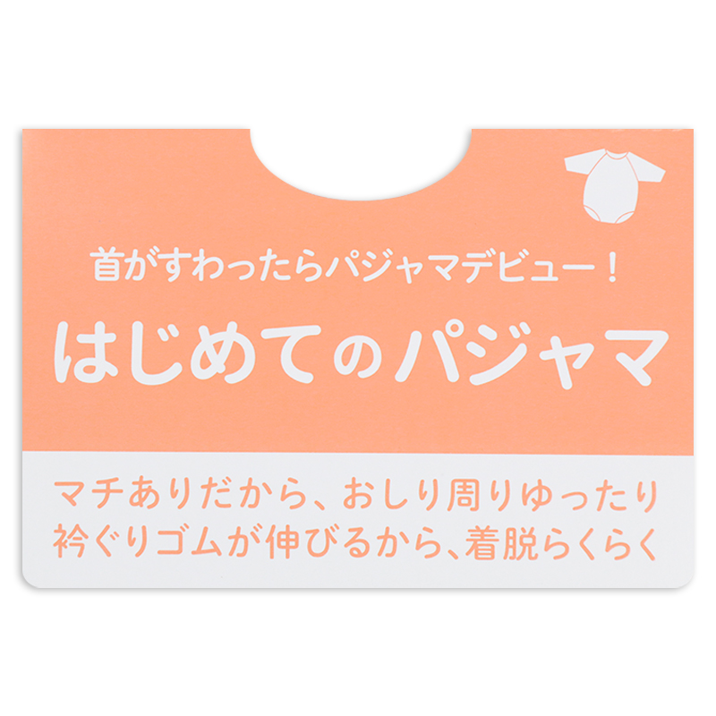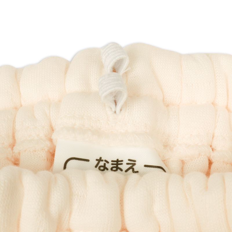 トップスの衿ぐりはゴム仕様で着脱しやすく、ロンパース型なので寝ている間もお腹が出にくい設計です。 パンツはお尻まわりにマチを入れ、ゆったりとした履き心地に。 お名前を書いてもにじみにくいお名前ネーム付きで、保育園などのお着替えの際にも便利です。 生地は中わたをはさんだキルト素材。肌面は綿100%でやわらかく、ふんわりとした着心地のよさが魅力です。 お子さまのパジャマデビューにぴったりなセットです。