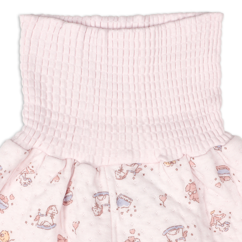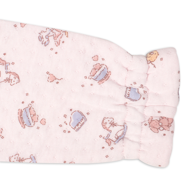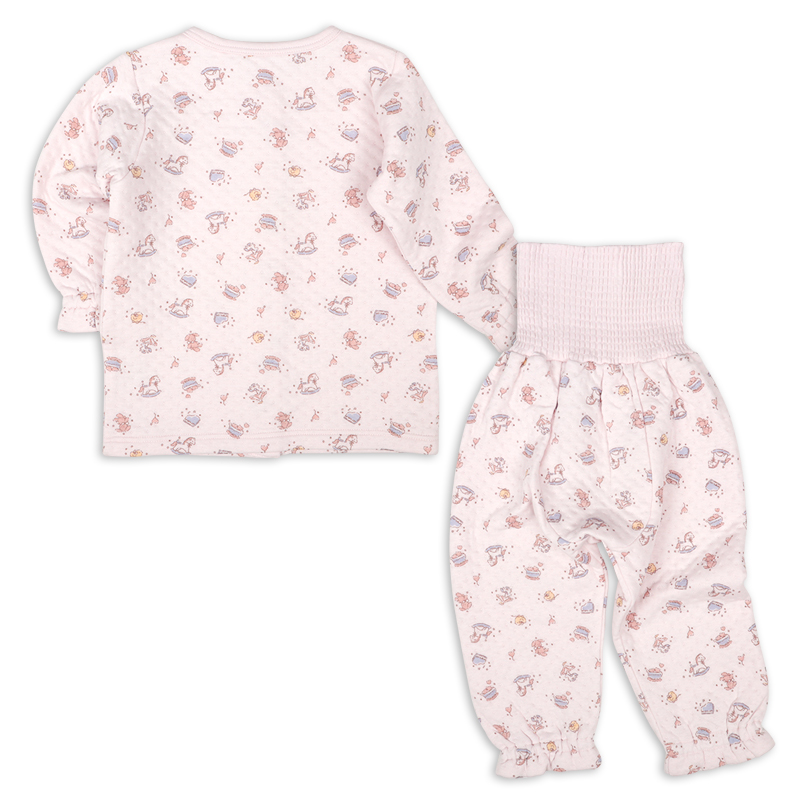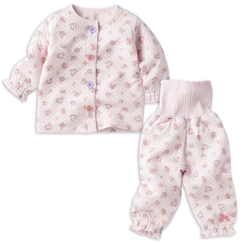 上衣のボタンとボタンホールは同じ色にすることで、掛け間違いを防ぎやすくしました。 小さな手でもつかみやすい、反りあがった形状のボタンを採用しているので、ボタン留めの練習にもおすすめです。 パンツには腹巻きが付いているので、寝ている間のお腹の冷えを防ぎます。 お名前を書いてもにじみにくいお名前ネーム付きで、保育園などのお着替えの際にも便利です。 生地は中わたをはさんだキルト素材。肌面は綿100%でやわらかく、ふんわりとした着心地のよさが魅力です。