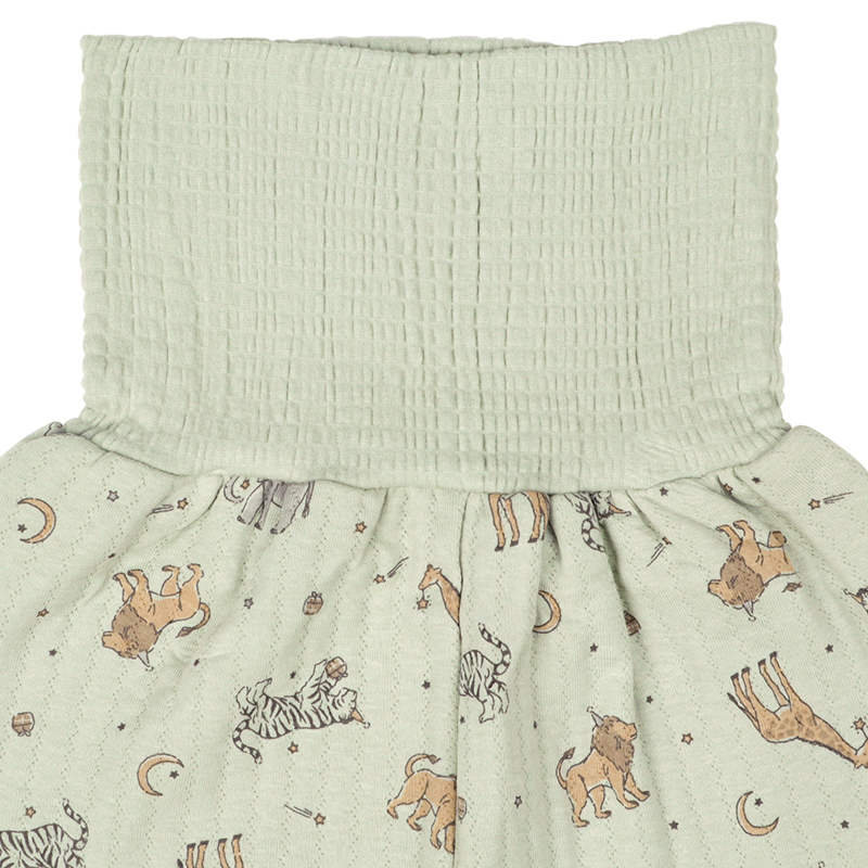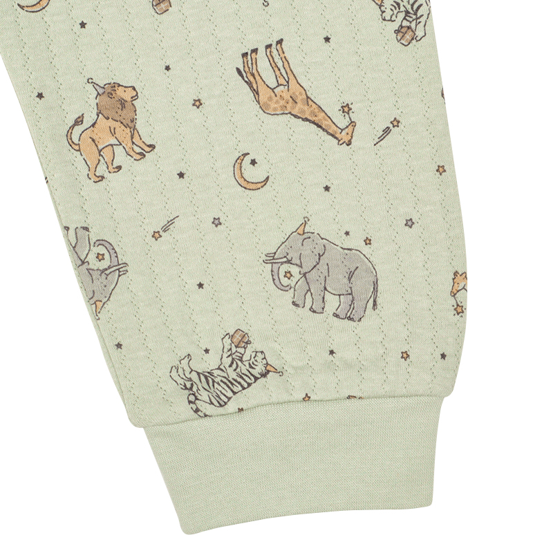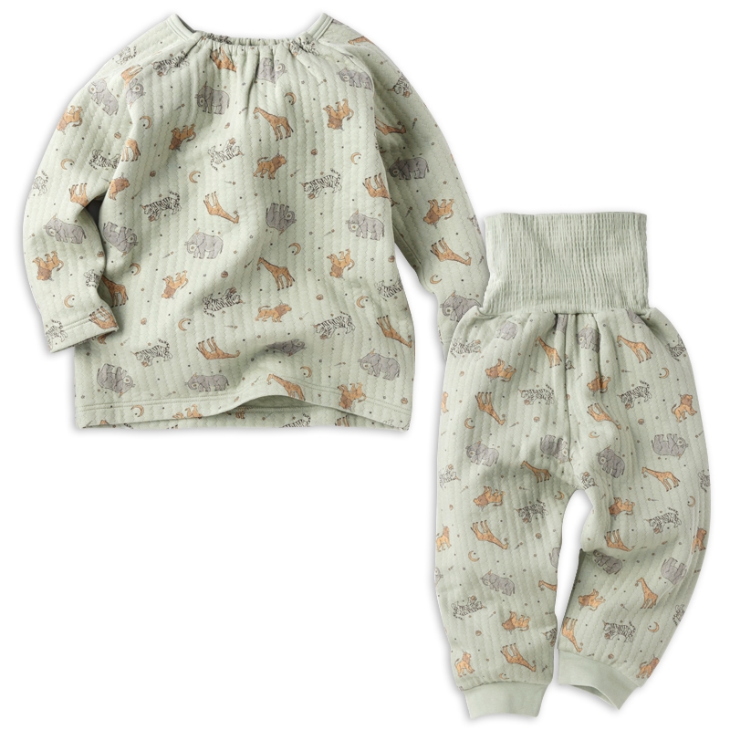 前後どちらでも着られるデザインで、お着替えがスムーズにできるパジャマです。 衿ぐりはゴム仕様で、着脱しやすくしました。 パンツには腹巻きが付いているので、寝ている間のお腹の冷えを防ぎます。 お名前を書いてもにじみにくいお名前ネーム付きで、保育園などのお着替えの際にも便利です。 生地は中わたをはさんだキルト素材。肌面は綿100%でやわらかく、ふんわりとした着心地のよさが魅力です。