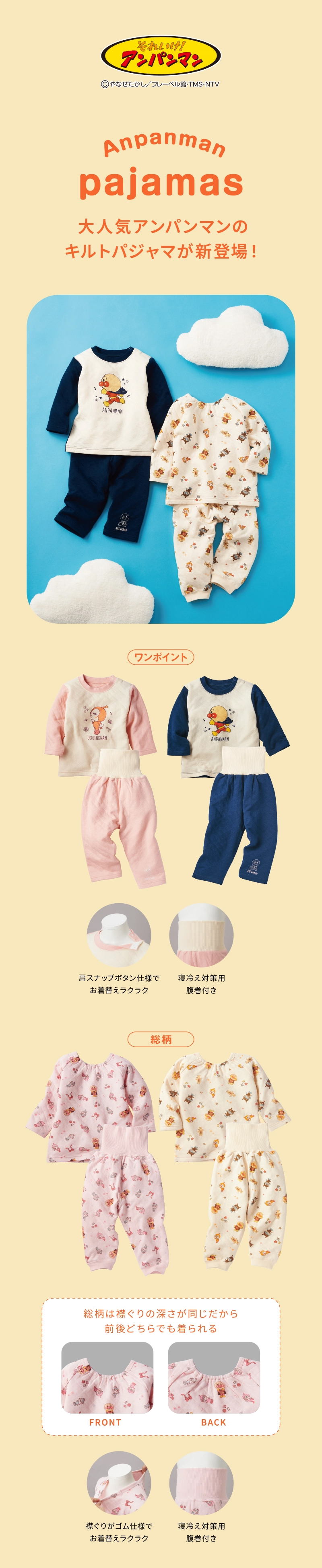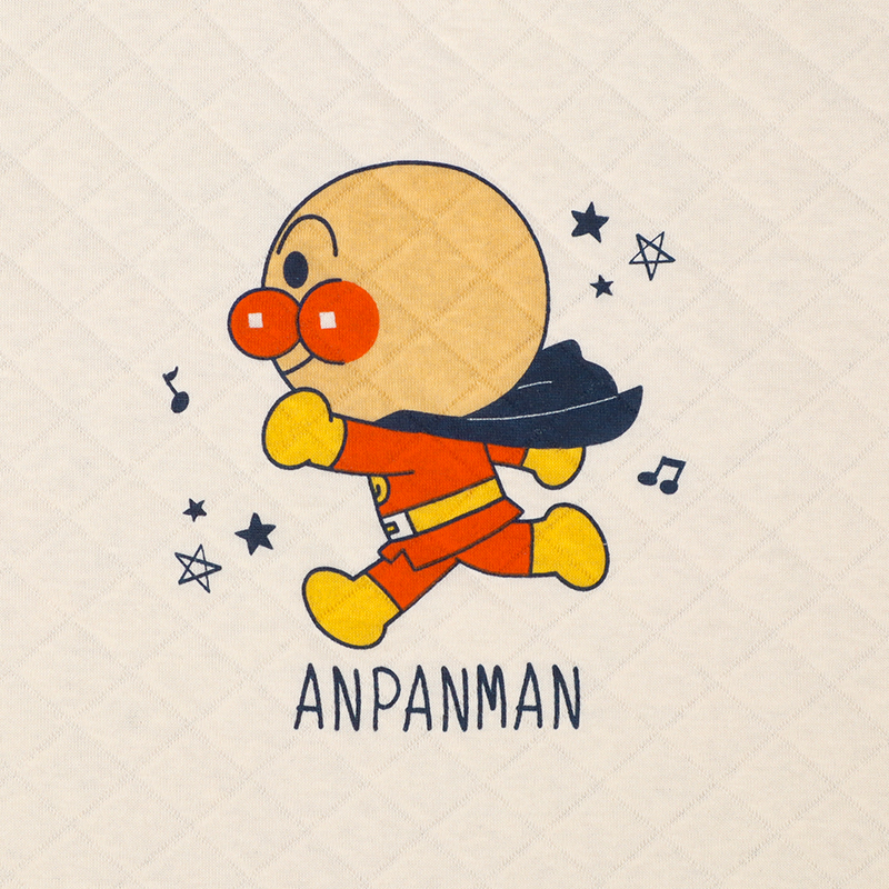 ●素材=本体 表側・裏側 綿100% 中わた ポリエステル100% 腹巻部分 綿97% ポリウレタン3% ●サイズ(約・cm)= [100](トップス)着丈44.5 背肩巾29.5 身巾34 袖丈31 (ズボン)ズボン丈50 股上19 腹巻巾16 ヒップ巾35.5 ●洗濯表示=洗濯可 ●原産国=中国製 (C)やなせたかし/フレーベル館・TMS・NTV