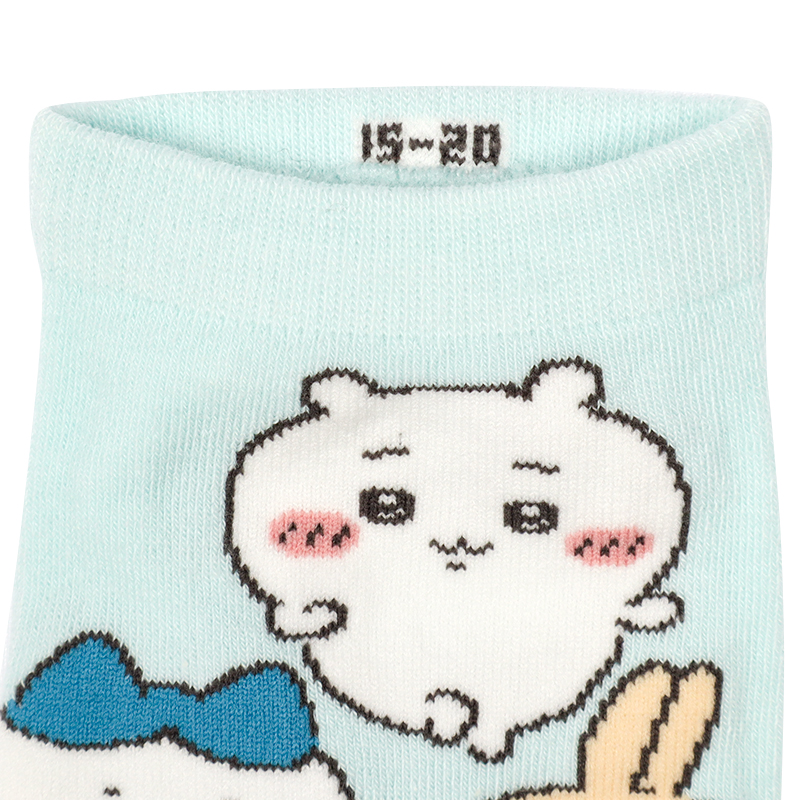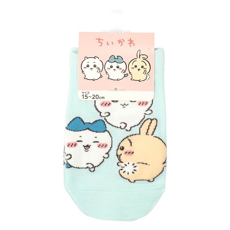 子供から大人まで人気のキャラクター『ちいかわ なんか小さくてかわいいやつ』キッズソックスです。ダンスしているちいかわ、うさぎ、ハチワレのデザインがかわいい靴下です。のび~る&フィット、伸縮性の良い糸を使用しています。足裏にはお名前欄がついています。