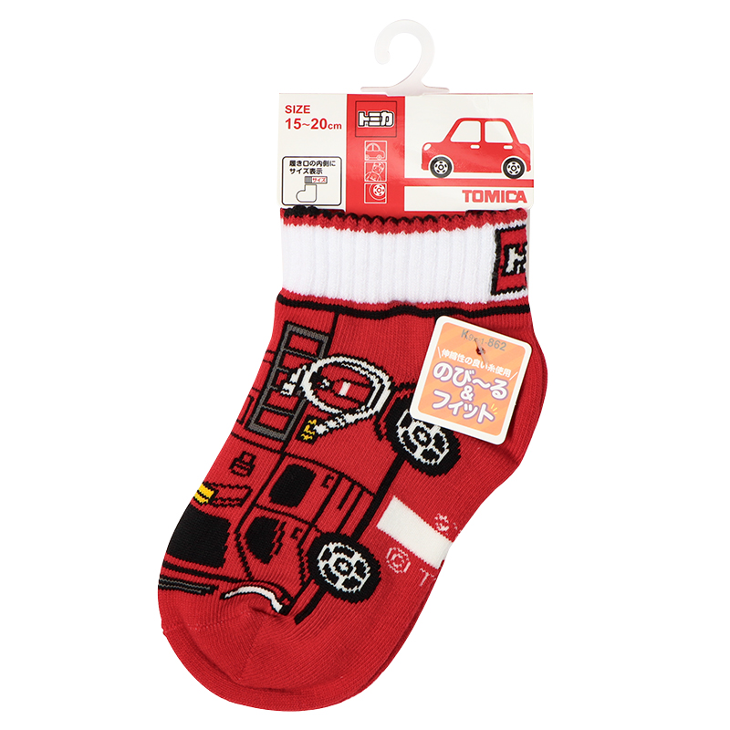 人気のトミカが靴下になって登場。あこがれのパトカー、消防車のなりきりソックスで楽しくお着がえできます。口ゴム内側にサイズ表示があります。伸縮性のよい糸を使用しています。足裏にはお名前欄がついています。