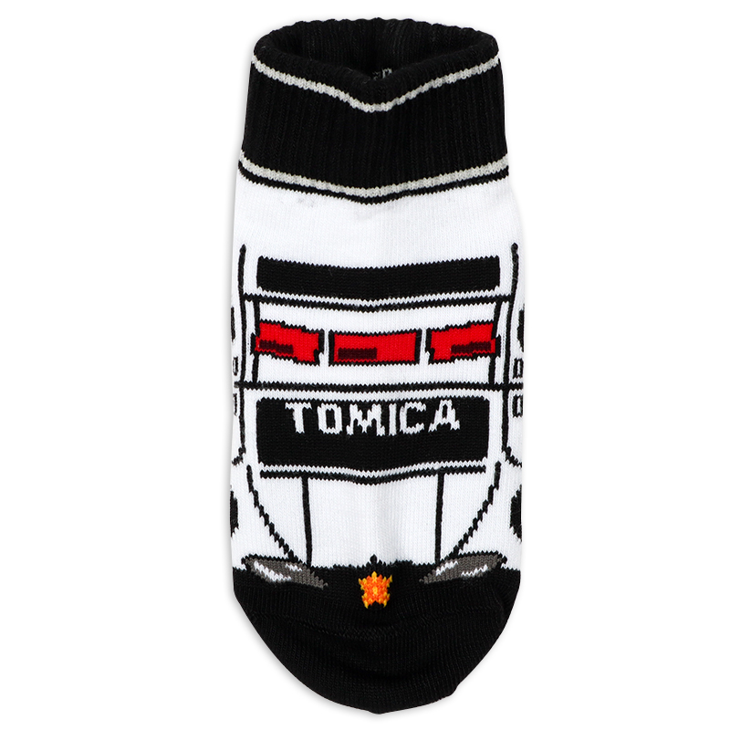 人気のトミカが靴下になって登場。あこがれのパトカー、消防車のなりきりソックスで楽しくお着がえできます。口ゴム内側にサイズ表示があります。伸縮性のよい糸を使用しています。足裏にはお名前欄がついています。