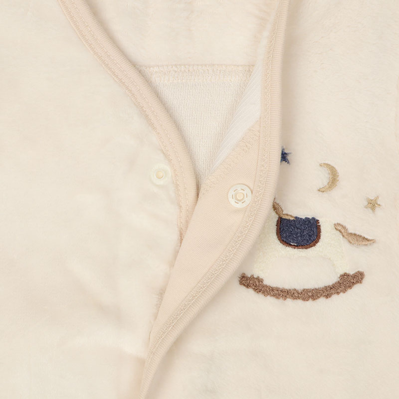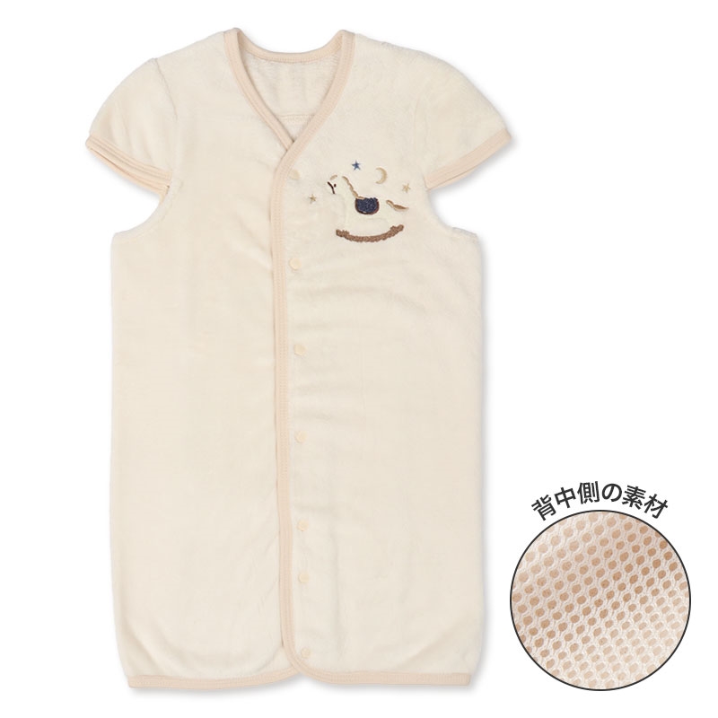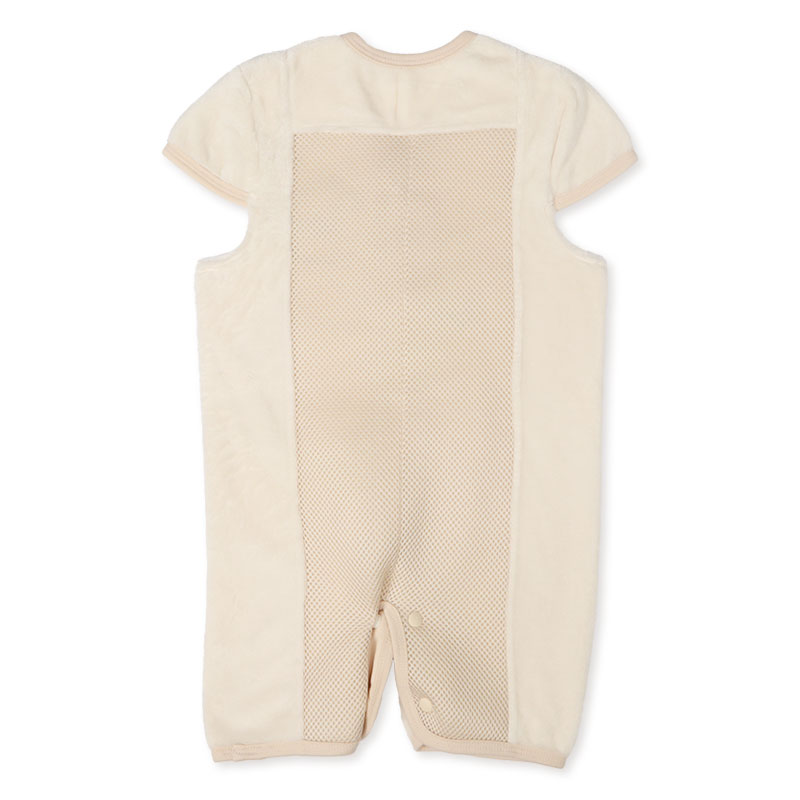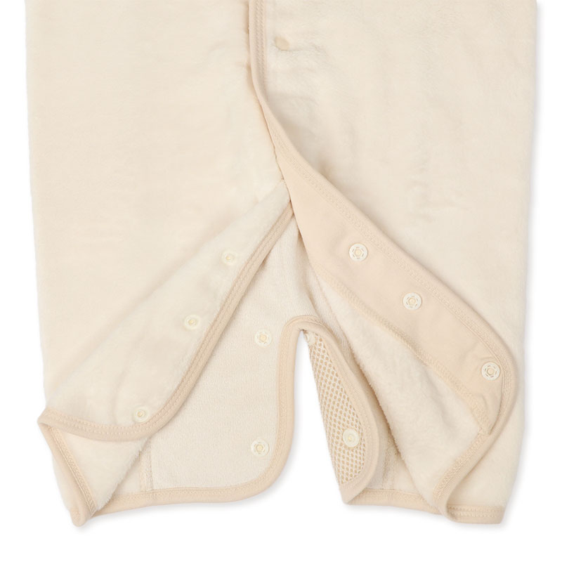 あったか素材のフランネルを使用しました。 しっかりとした厚みがあり触り心地も良く、ずっと触っていたい秋冬に大活躍の素材。 蒸れがちな背中部分はメッシュ素材で通気性を確保しています。 股下のボタンを取り換えるだけでスリーパーとしてショートオールの2WAYとして着用出来るため、 赤ちゃんの成長に合わせて仕様が選べます。