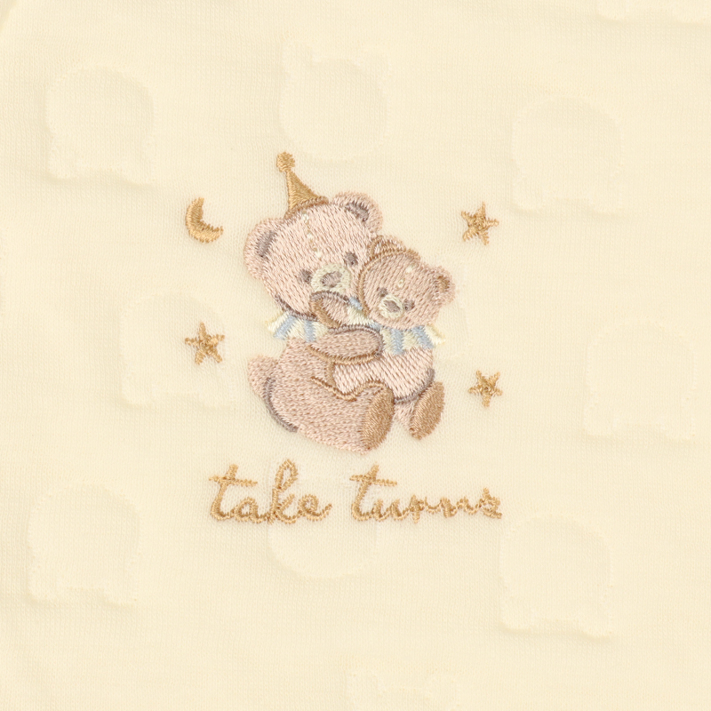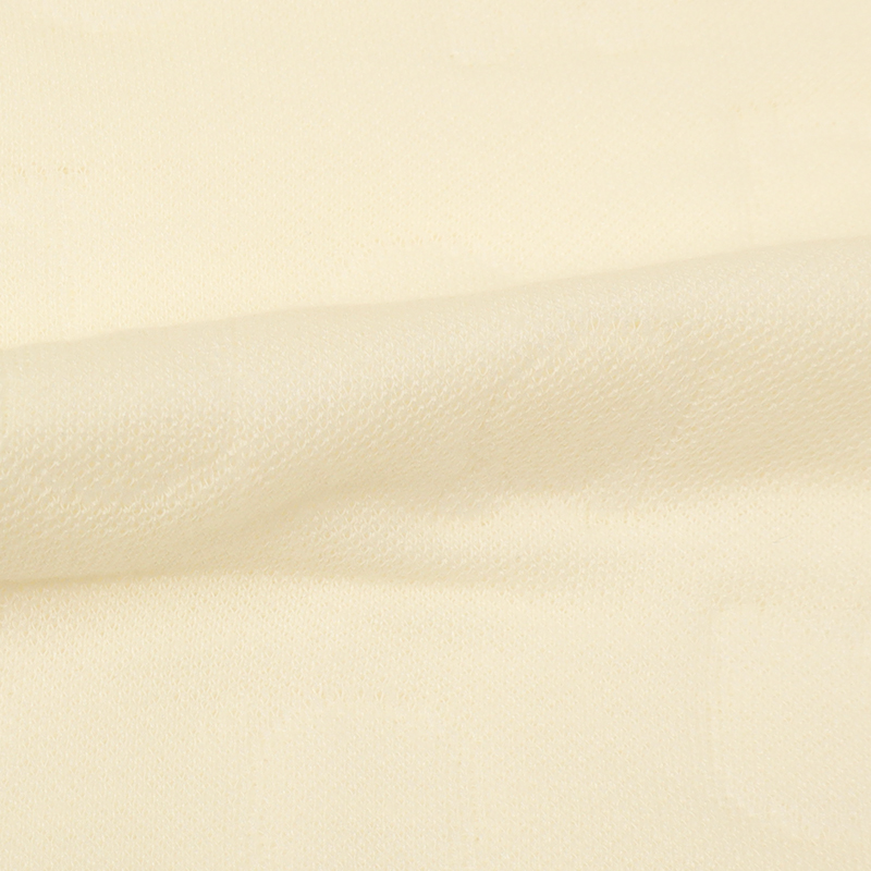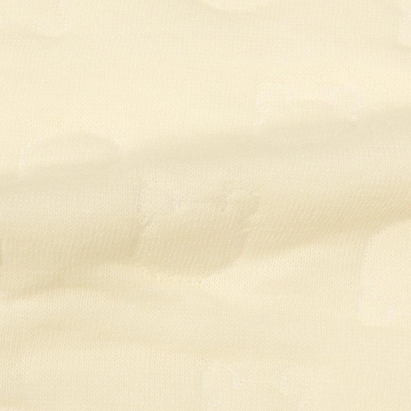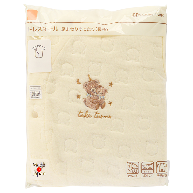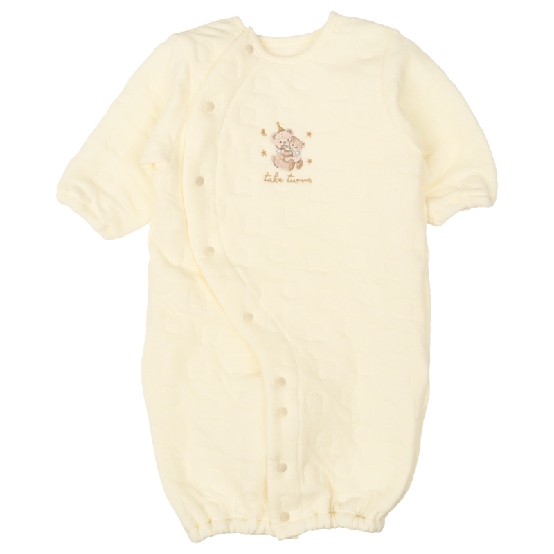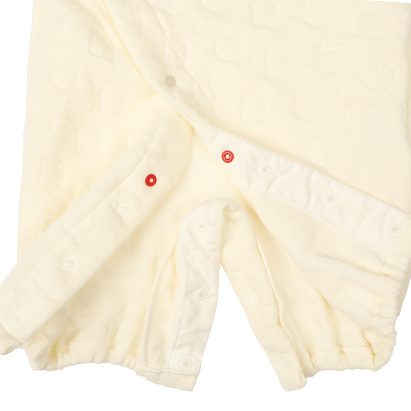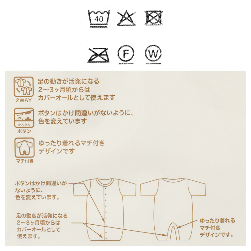 着丈51cm、身幅27cm、肩幅20cm、袖ぐり13cm、袖丈19cm、袖口巾6.5cm、天巾9cm、襟巾1cm、股上39.5cm、股下13.5cm 組成 表側 綿100% 中糸 ポリエステル100% 裏側 綿50% ポリエステル50%