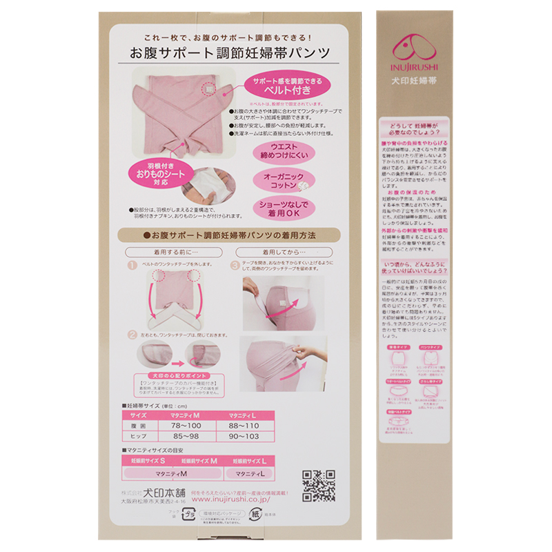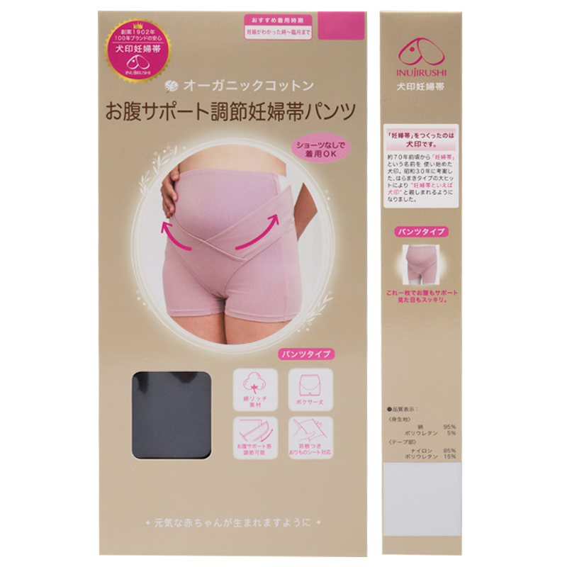 伸縮性のよいコットンリッチ素材。 素材は肌にやさしいオーガニックコットン使用。 取り外し不要のベルトでお腹を下からサポート。 ワンタッチテープでサポート感を簡単調節。 ショーツなしで一枚ばきできます。 お尻を包み込むボクサータイプ。 洗濯ネームが外付けで、直接肌に当たらずちくちくしない仕様。 羽根つきおりものシート対応。