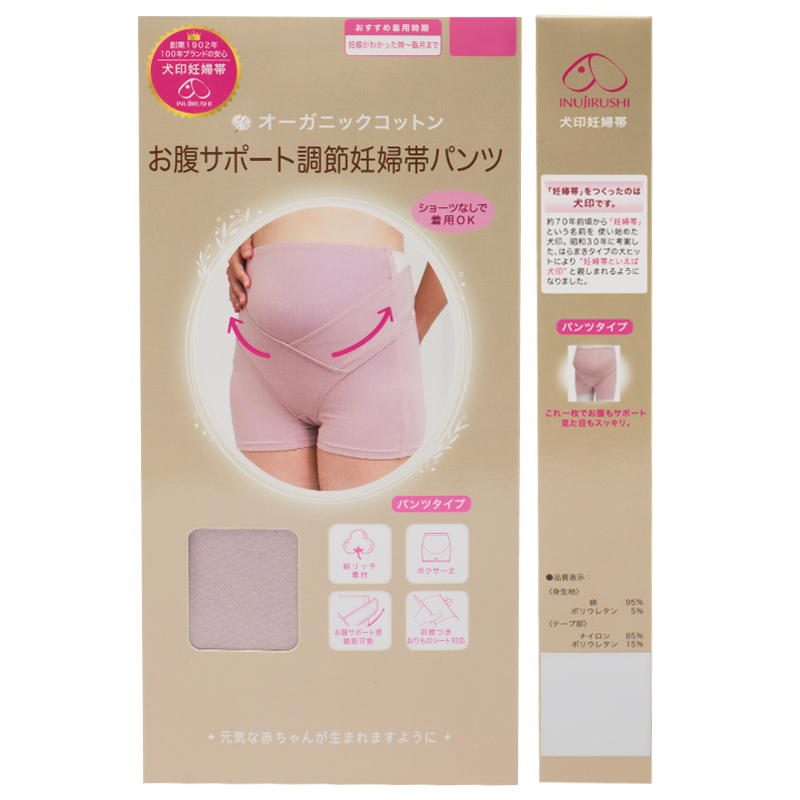伸縮性のよいコットンリッチ素材。 素材は肌にやさしいオーガニックコットン使用。 取り外し不要のベルトでお腹を下からサポート。 ワンタッチテープでサポート感を簡単調節。 ショーツなしで一枚ばきできます。 お尻を包み込むボクサータイプ。 洗濯ネームが外付けで、直接肌に当たらずちくちくしない仕様。 羽根つきおりものシート対応。