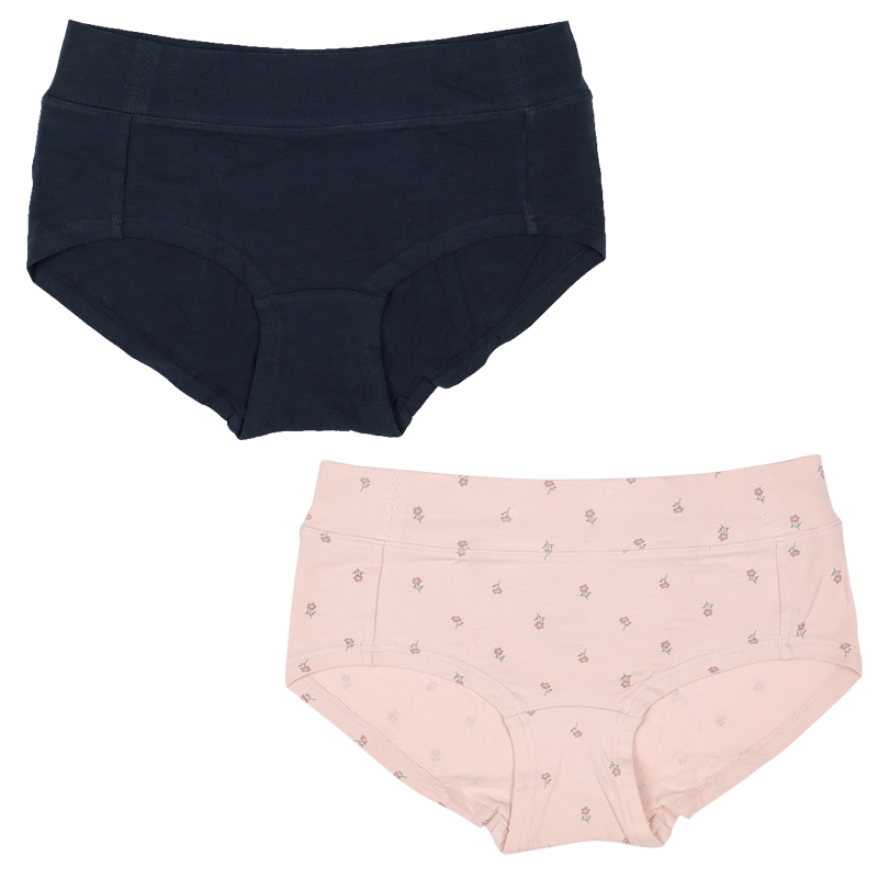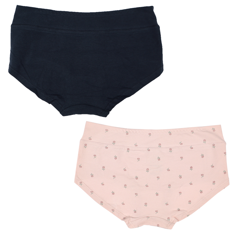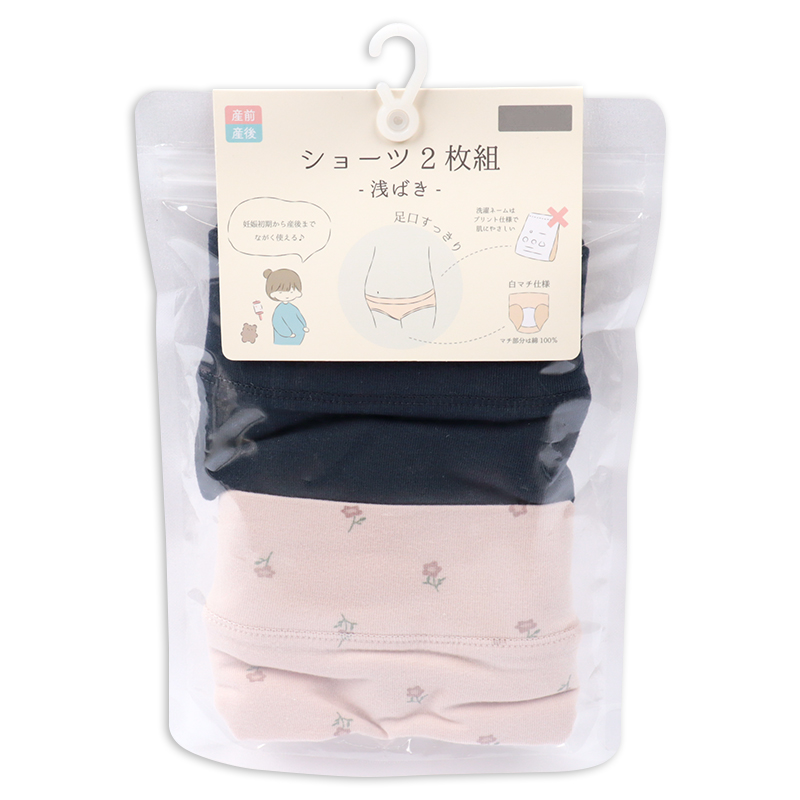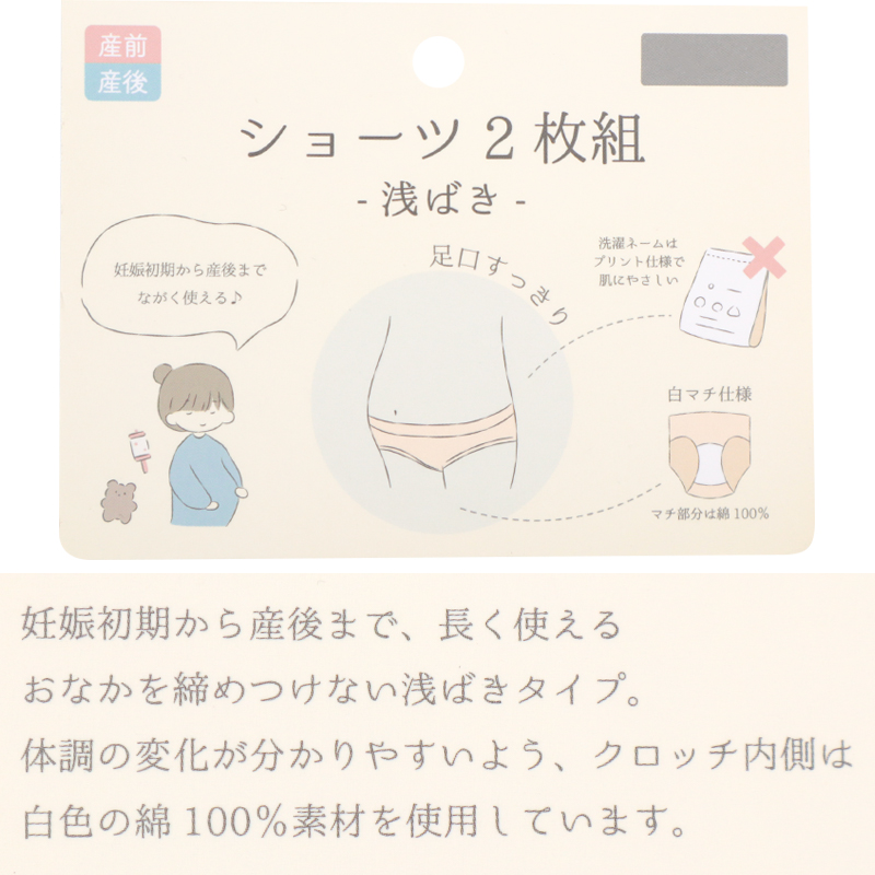 ストレッチ素地で、やわらかいはき心地の綿混素材を使用しています。 妊娠初期から産後まで長く使えるお得な2枚組です。 足口すっきり仕様でゴムも使用していないので、食い込みにくいやさしいはきごこち。 内側のクロッチ部分は白い綿素材で、少量の出血やおりものの変化も見逃しません。 洗濯ネームはプリントでチクチクしません。