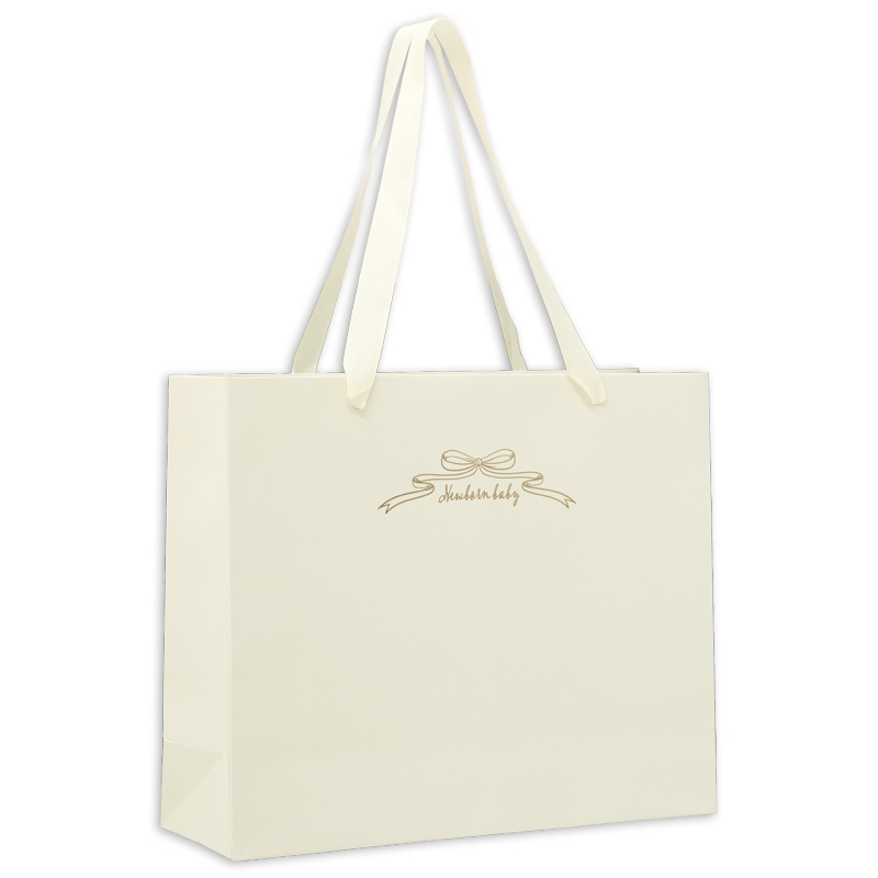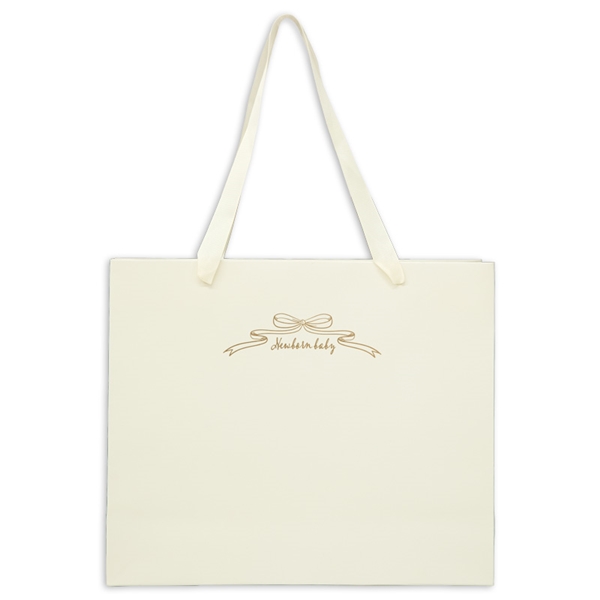ご出産お祝いや、懐妊お祝いをお贈りする時にお使い頂ける紙袋です。 マットな質感に、ゴールドの箔プリントロゴがあしらわれた高級感のあるデザインです。 やさしいアイボリーの色味なので男女問わずお使い頂けます。 プレゼントのお渡しの瞬間の気分も上がる、嬉しいアイテムです。