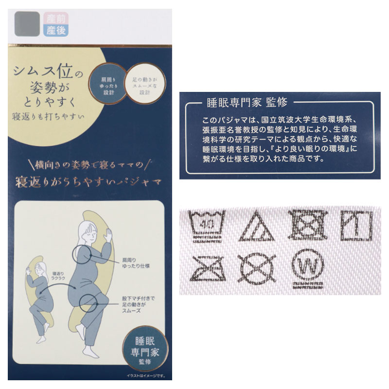 夏以外の季節に対応できる素材のマタニテイーパジャマです。肩周りゆったり仕様で股下にマチが付き足の動きがスムーズ。横向きの姿勢で寝るママのための寝返りがうちやすいパジャマです
