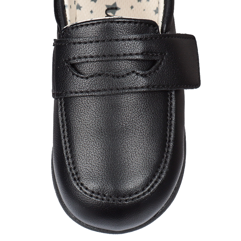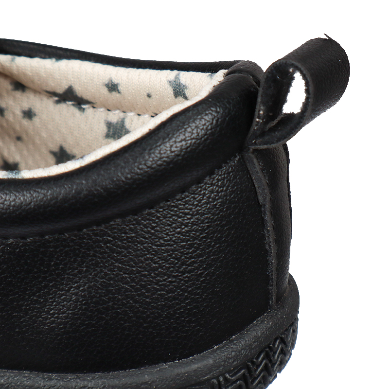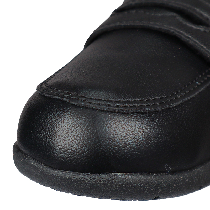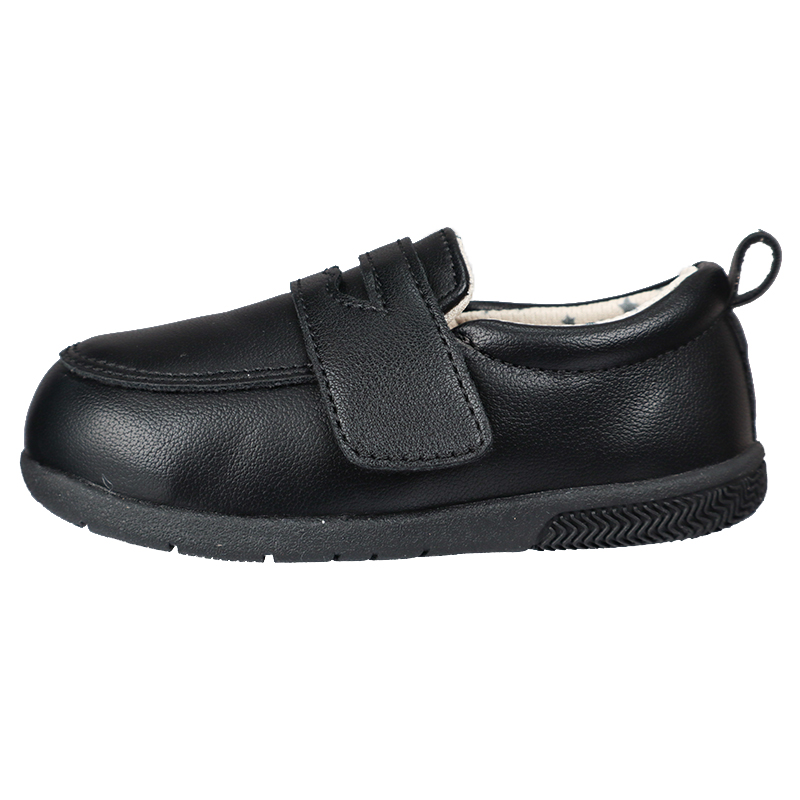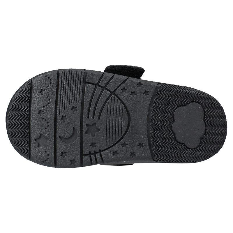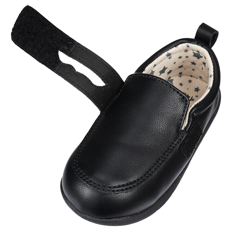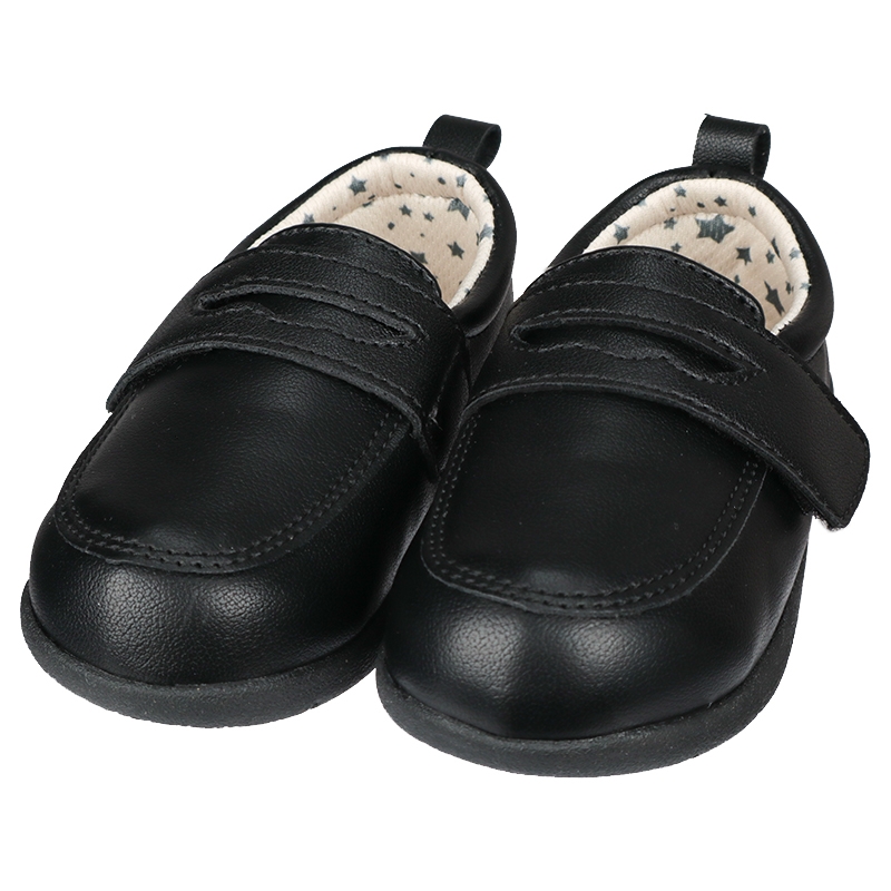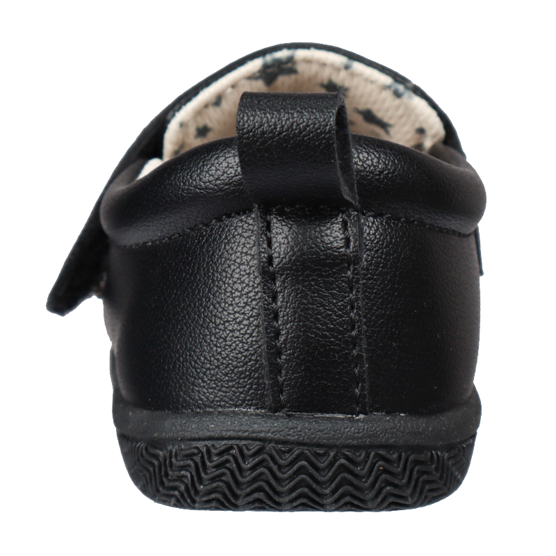気品ある合皮素材と黒色がエレガントさを演出。面ファスナー仕様で履きやすい。屈曲性あるソールも魅力的。柔らかい素材を使用しておりカジュアルにも使いこなせます。