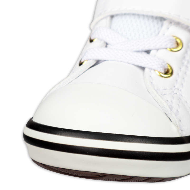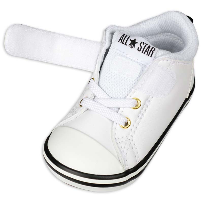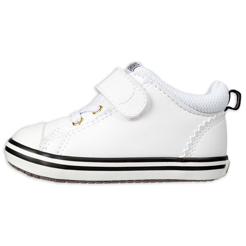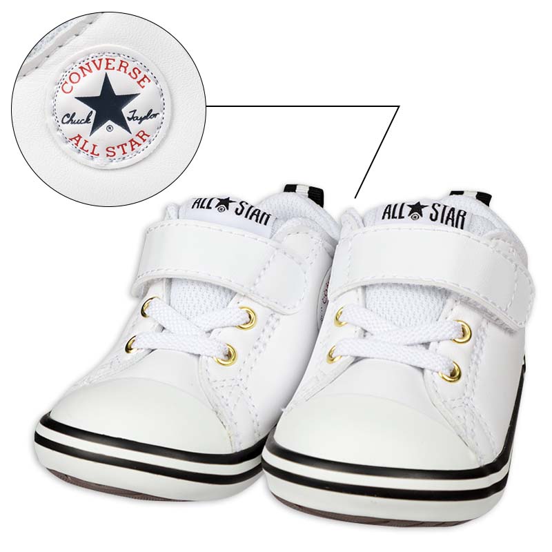 ・シンプルで様々なコーディネートに合わせやすいシンセティックレザーモデル ・好評のホワイトベースに、ゴールドのアイレットを採用した1カラー展開 ・しなやかなラバーを採用し足の曲がる位置でしっかり屈曲する足に優しい仕様 ・踵にフィットしやすいよう履き口にパッドを使用 ・ベルトタイプで脱ぎ履きしやすいデザイン ・サイズチェッカーがプリントされたギフトボックス仕様