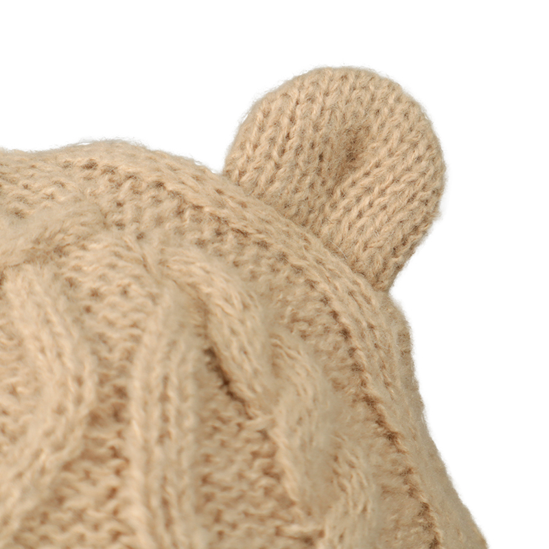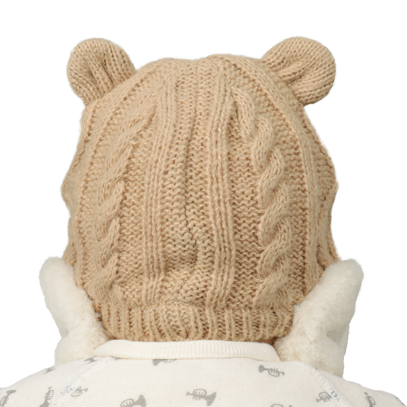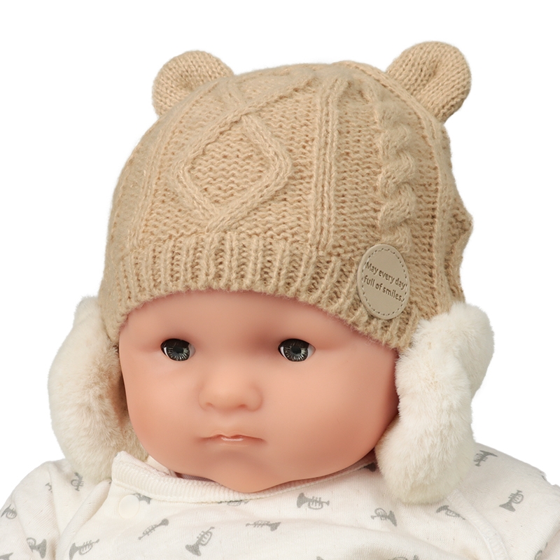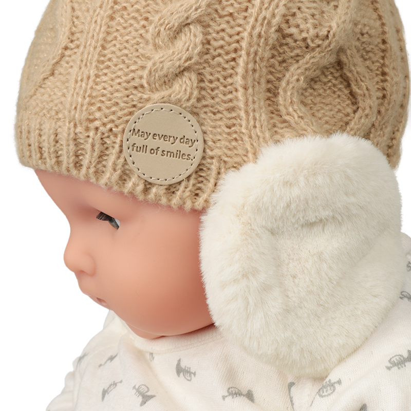 やさしい色でつくる、アニマルモチーフのアイテムです。 本体はナチュラルテイストにまとまる、ケーブル編み。 ふわふわファーのイヤマフ付きで、お子様の耳元を暖かく包みます。 被り口は合皮ネームが飾り、こなれた印象をプラスします。 内側は裏地付きで、肌当たりがソフトです。