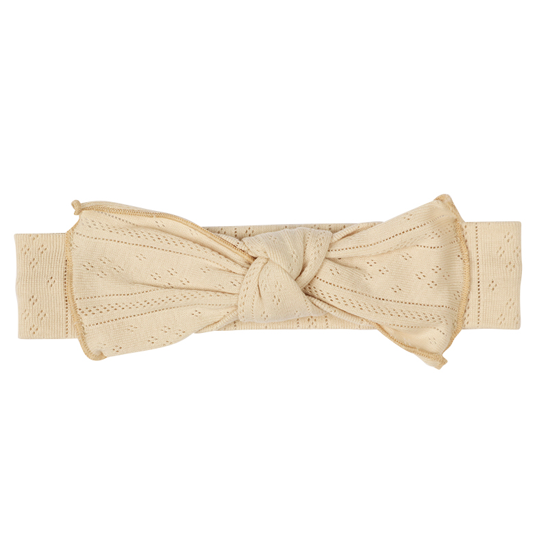 フロントを飾る大きなリボンがポイントのアイテムです。 透かし編みの入ったニットが、可愛らしい。 リボン縁はメロー仕上げで、おしゃれなアクセントになります。 バンド部分は伸縮性があるので、頭に被せやすく、ずれにくいです。