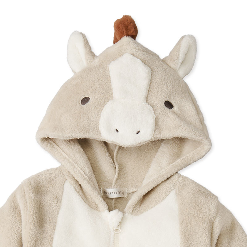 フリース素材で来年の干支をデザインしたフード付きカバーオールです。 フードがうまの顔になったかわいいカバーオールです。 ファスナー使いの前開き仕様で着脱が簡単にできます。 年賀状などの撮影や新年に家族が集まった時の写真撮影に大活躍するアイテムです。