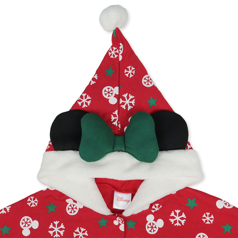 温かい裏起毛素材のディズニーデザインのケープです。 かわいい総柄デザインにミニーの耳とリボンがついた仕様になっています。 持ち運びもしやすく、クリスマスシーズンにぴったりの一着でです。 お子さまが寒い冬の日も楽しく過ごせるアイテムです。