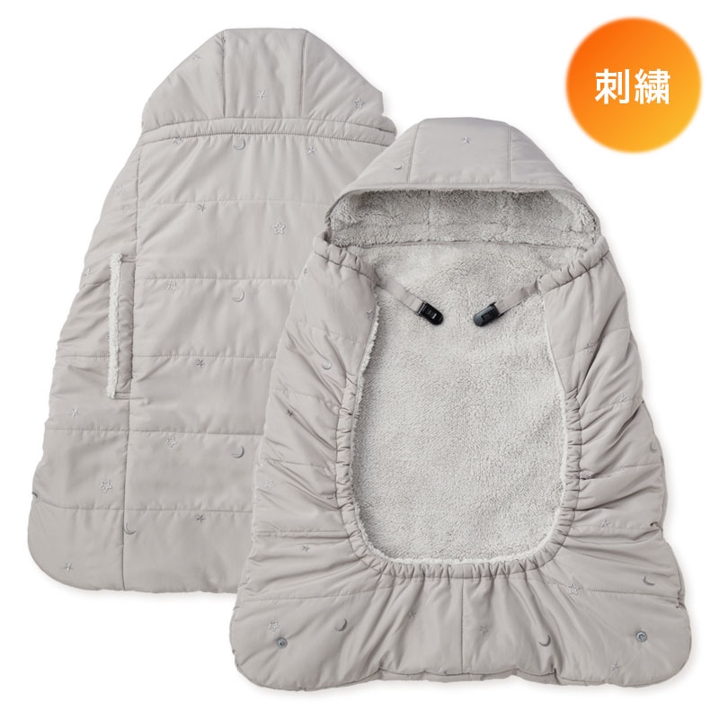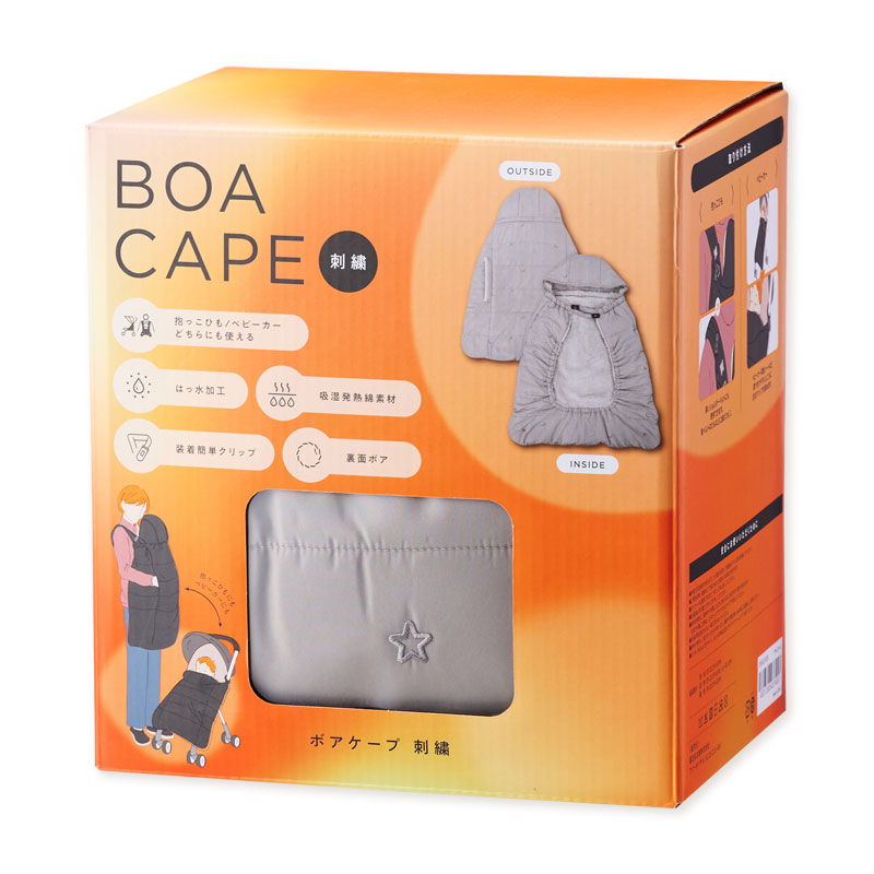 ベビーカーにもだっこひもにも装着簡単で、 吸湿発熱中綿と裏地にボアを使用しあたたかく、 撥水機能が付いた中綿ケープになります。 表地にはおしゃれな総柄刺しゅうが施されておりとてもかわいい商品になっています。 足元まで覆う仕様になっている為、寒さや風からも赤ちゃんを守ります。