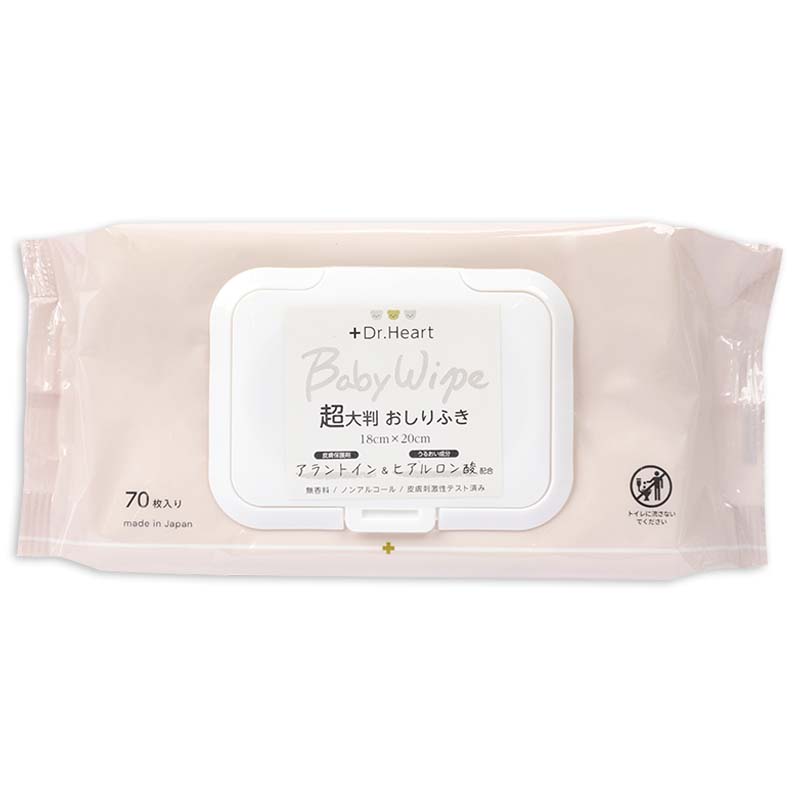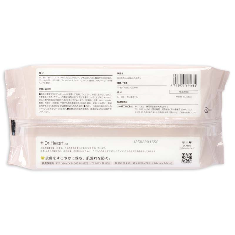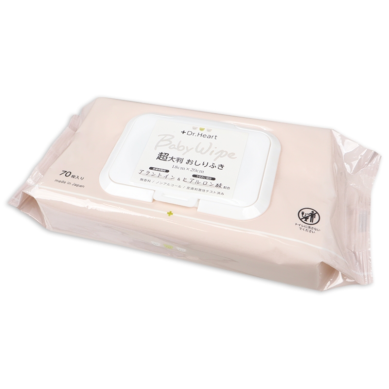 ○アラントイン・GK2・ヒアルロン酸配合 ○何回も折って使える大判シート 180×200mm ○皮膚を健やかに保ち、肌荒れを防ぐ ○フタ付きタイプ ○新生児から使える ○赤ちゃんの全身拭ける体ふきとしても ○ドクターハート初めての大判タイプ