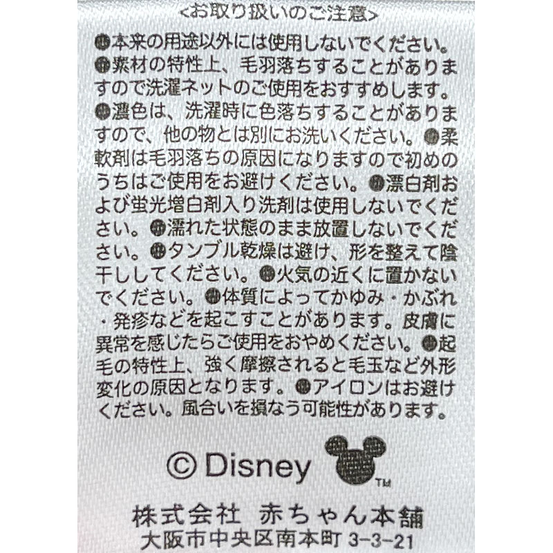 ●サイズ:[身長]50~80cm [体重]3~11kg ●素材:ポリエステル100% ※お取り扱いのご注意 ・本来の用途以外には使用しないでください。 ・素材の特性上、毛羽落ちすることがありますので洗濯ネットのご使用をおすすめします。 ・濃色は、洗濯時に色落ちすることがありますので、他の物とは別にお洗いください。 ・柔軟剤は毛羽落ちの原因になりますので初めのうちはご使用をお避けください。 ・漂白剤および蛍光増白剤入り洗剤は使用しないでください。 ・濡れた状態のまま放置しないでください。 ・タンブル乾燥は避け、形を整えて陰干ししてください。 ・火気の近くに置かないでください。 ・体質によってかゆみ・かぶれ・発疹などを起こすことがあります。 皮膚に異常を感じたらご使用をおやめください。 ・起毛の特性上、強く摩擦されると毛玉など外形変化の原因となります。 ・アイロンはお避けください。風合いを損なう可能性があります。 (C)Disney