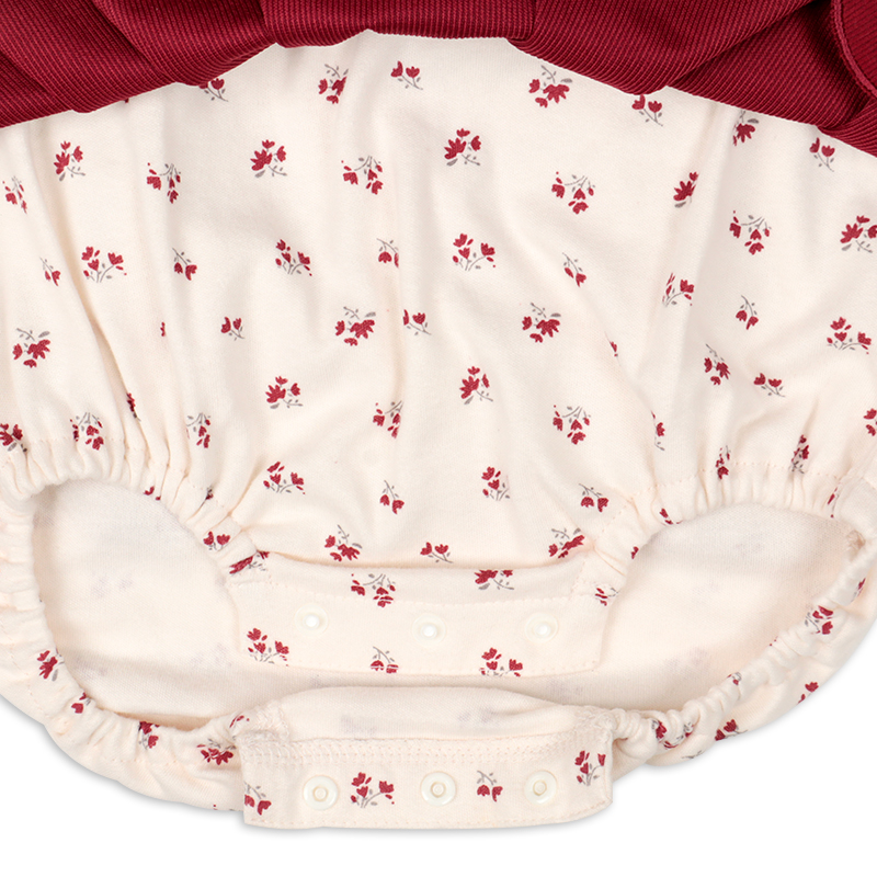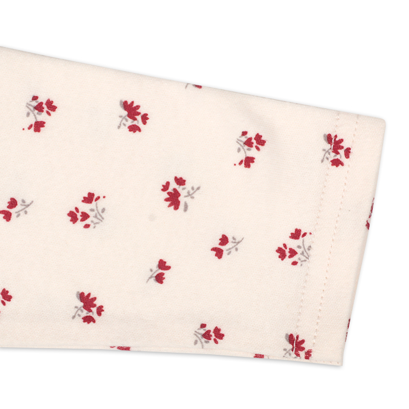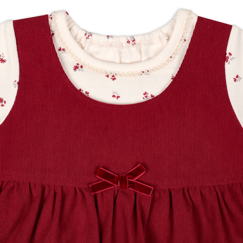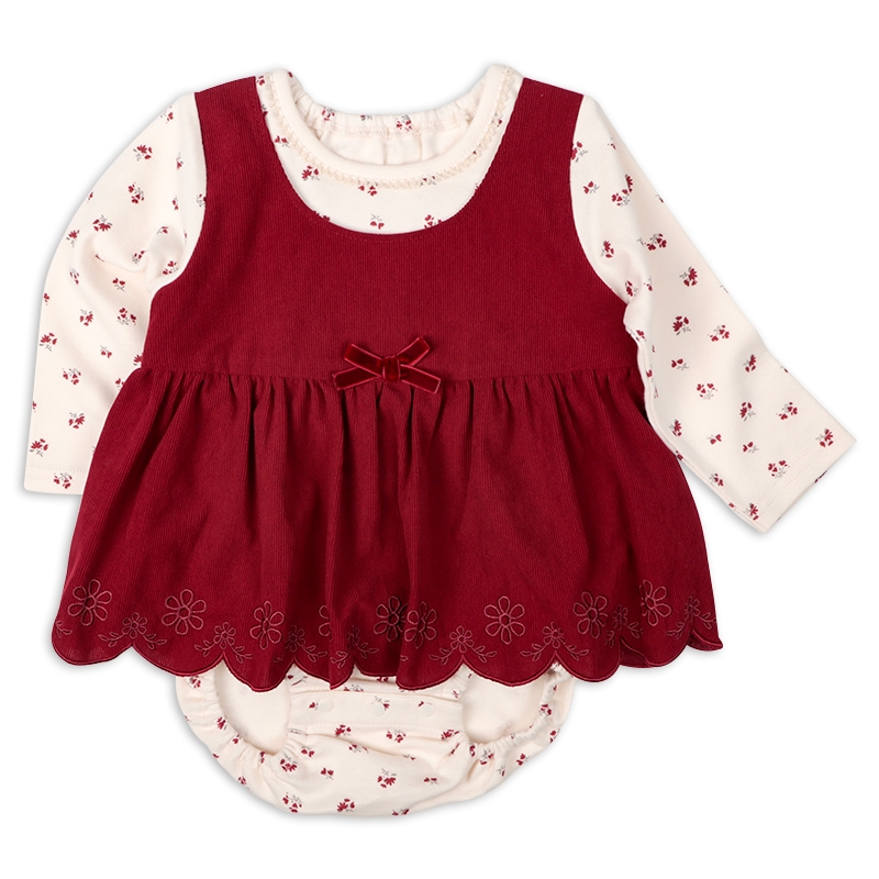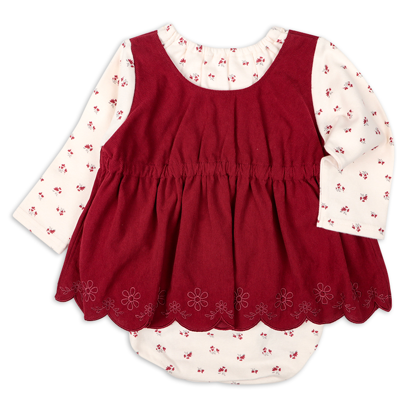 小花柄プリントをあしらったロンパースに、スカラップ刺しゅうがわかいいコール天のジャンパースカートが肩部分でつながっている重ね着ワンピース風のアウターロンパースです。 ロンパース本体は肌触りのいい起毛スムースを使用しています。 上下つながっているので、元気に動きまわってもお腹や背中が出ることがありません。 股の部分はスナップボタンで開くようになっていて、 直接肌に当たらず、おむつ替えにも便利です。