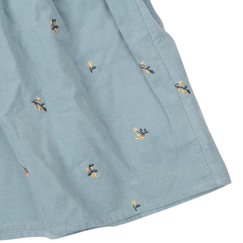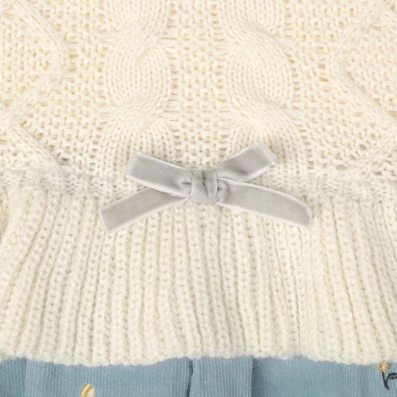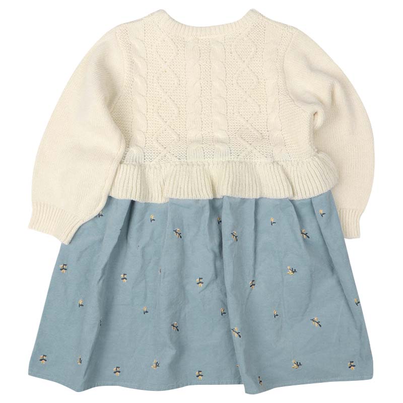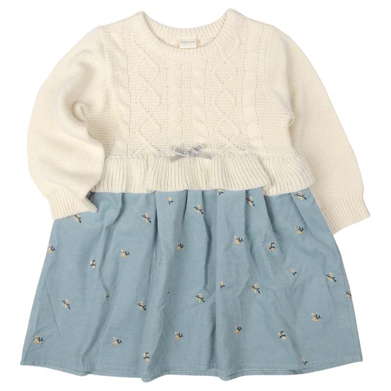 ●素材=ニット部分 アクリル100% 布帛部分 綿100% 刺しゅう糸 ポリエステル100% ●サイズ=100/110/120 総丈 53/58/63 身巾 35/37/39 肩巾 25/27/29 裾巾 63/66.5/70cm