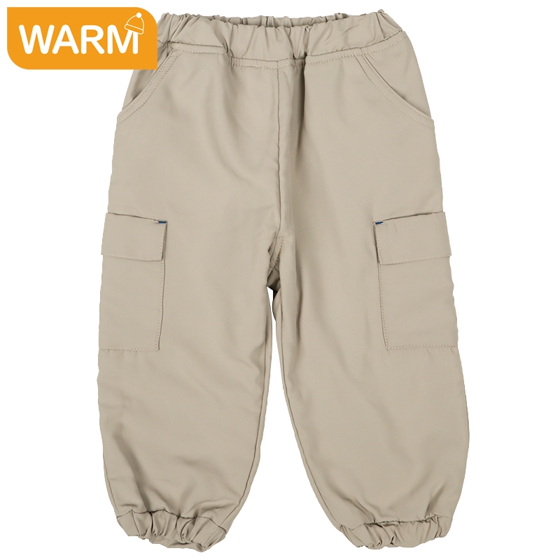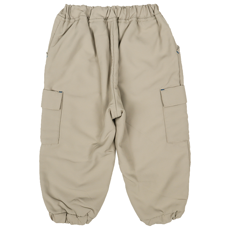 表地はポリエステルタフタ、裏地は起毛感のあるマイクロフリースの2枚生地で仕立てたカーゴパンツです。防寒にぴったりなあったかパンツに仕上げています。通園通学からお出かけまで寒い冬を乗り越えるのにおすすめの商品です。