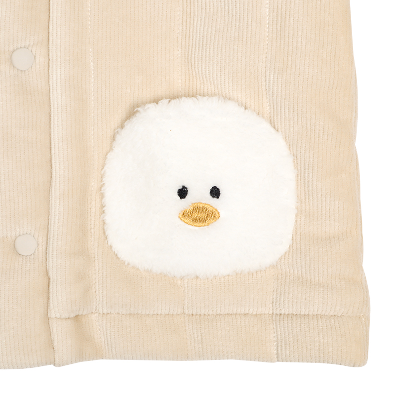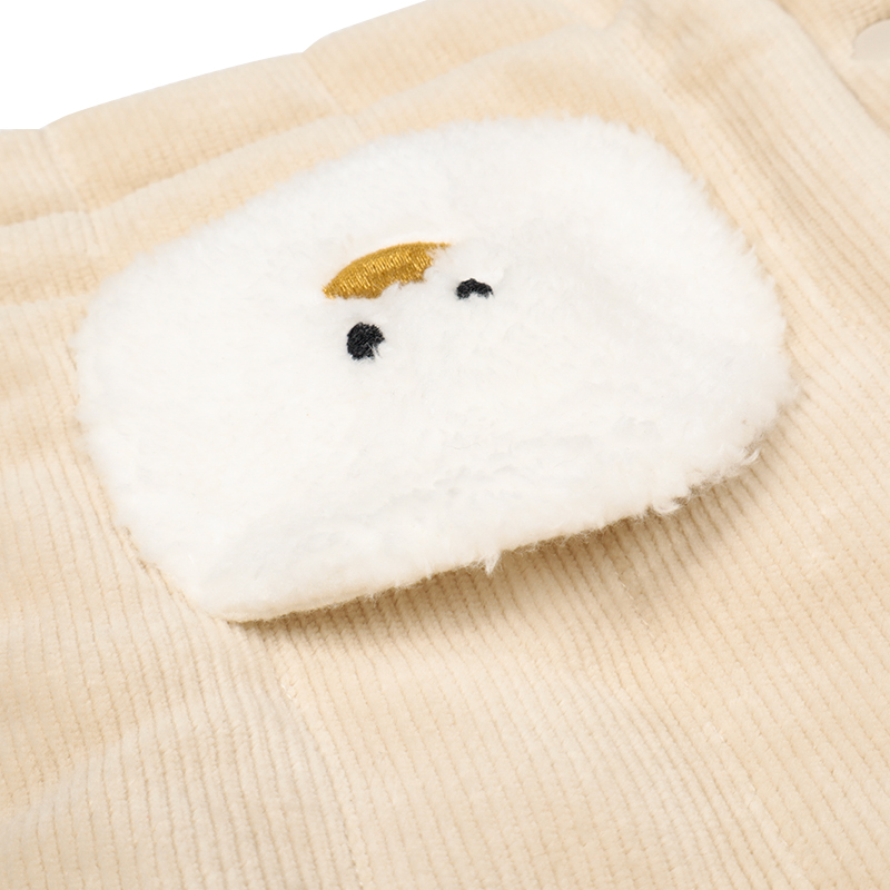 表地はやわらかいニットコール、中わたはソフトなファイバー綿を使用、裏地にはマイクロフリースを用いた寒い冬にぴったりの商品になっております。もこもこボアのアニマルポケットがかわいらしさを引き立てるデザイン。