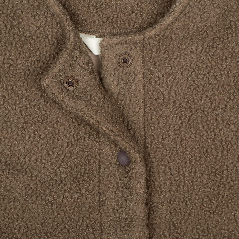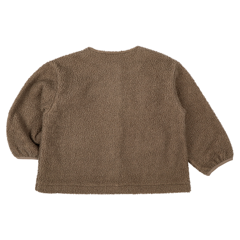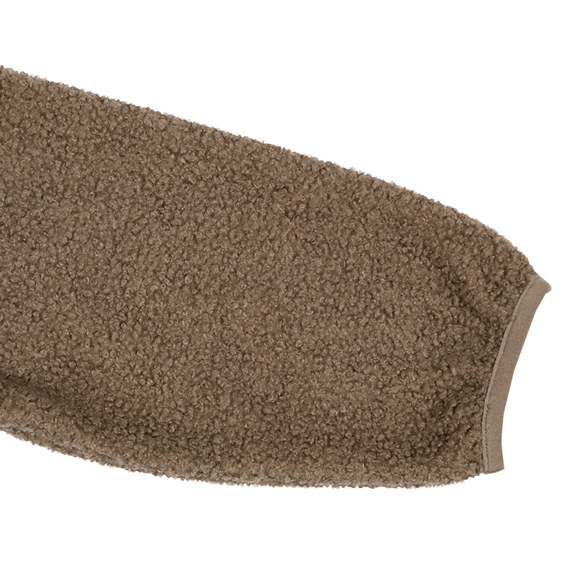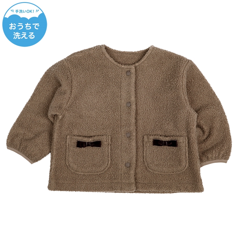 ボア素材と肌触りのよいシャギー素材とをボンディングした1枚生地で仕立てたカジュアルジャケットです。2枚の生地がボンディングされているため、軽くてあたたかいのが特徴。首元はノーカラー仕様のため、下に厚着をしてもすっきり見えるデザインです。