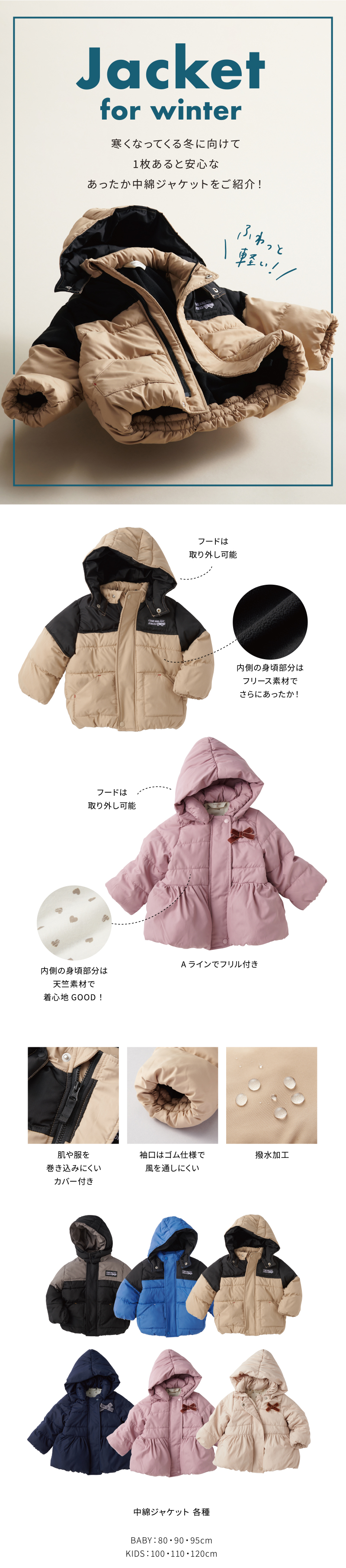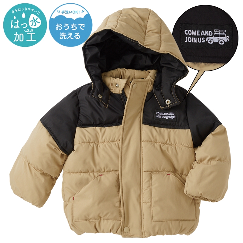 ベーシックなデザインとカラー展開で、どんなコーディネートにも合わせやすい1着です。 表地のはっ水加工も嬉しいポイント。フードは取り外しが可能な2WAY仕様のため、通園通学からお出かけまで幅広いシーンにおすすめです。