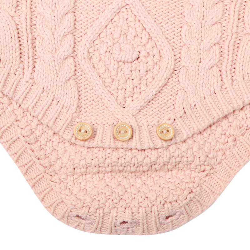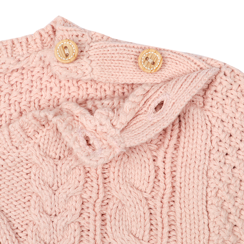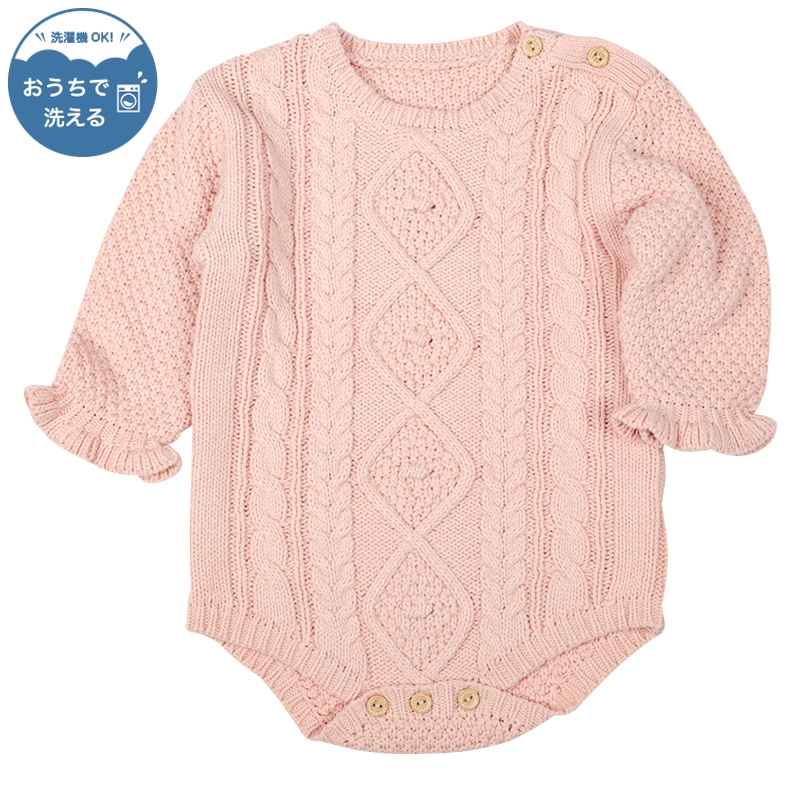 赤ちゃん本舗オリジナルデザインのニットロンパースです。凹凸が入った編み柄と袖口のフリルが可愛いデザインです。綿混アクリル素材を使用しています。肩、股部分に木風ボタン仕様もかわいいポイントです。ご家庭で洗濯できるので、普段着からお出掛け着まで幅広く使えて手軽にニットが楽しめます。
