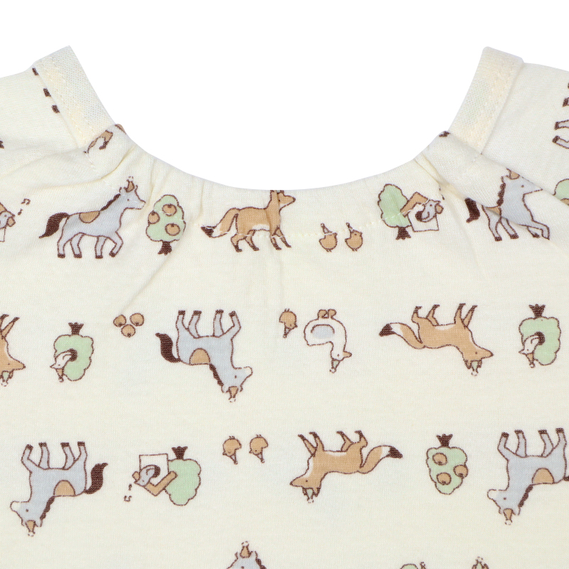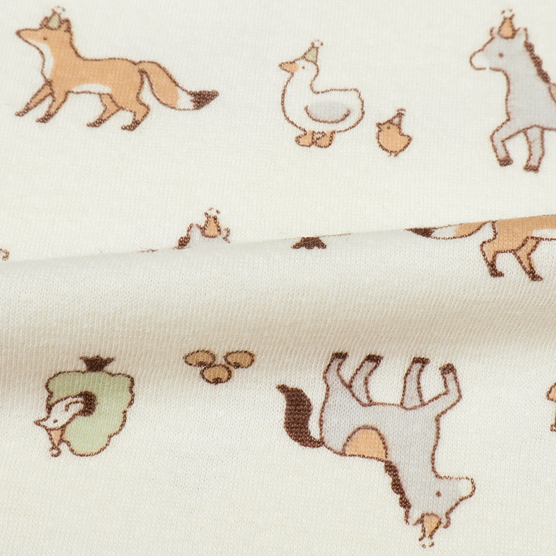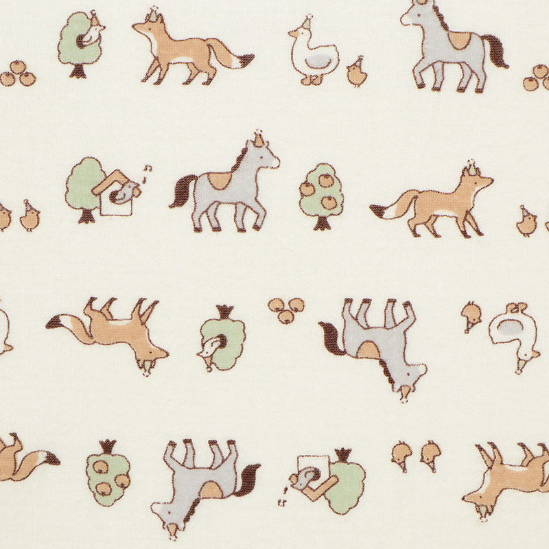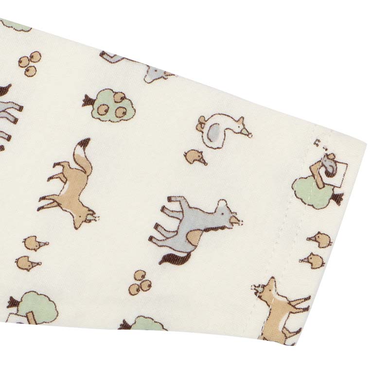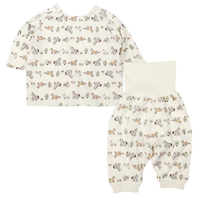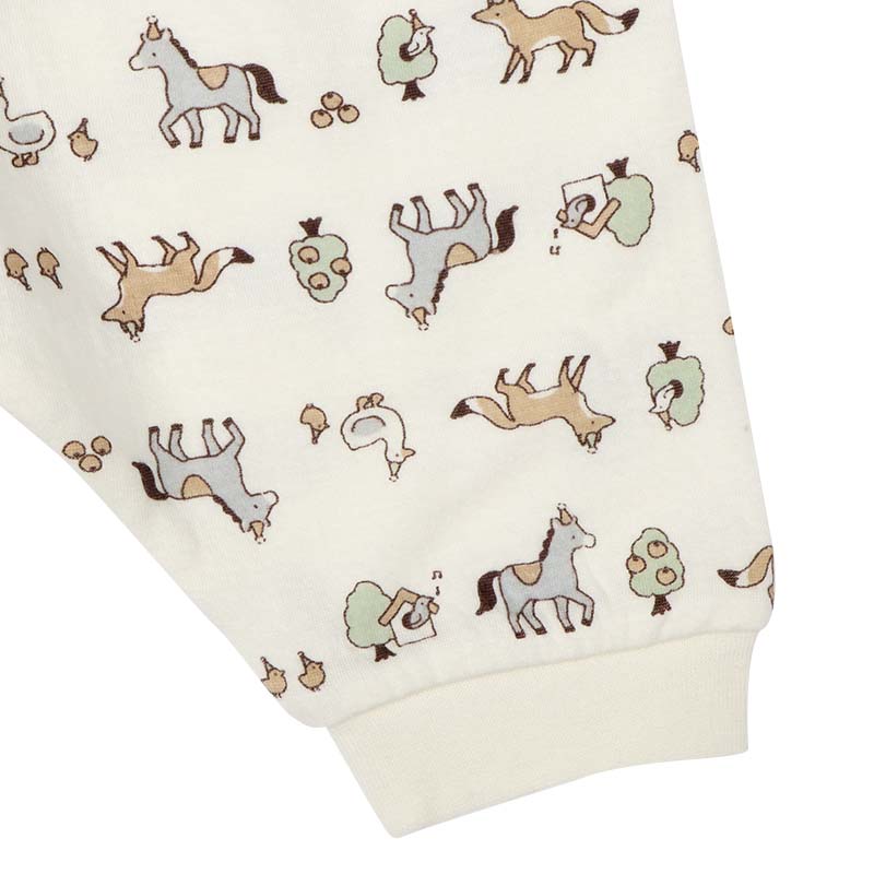 ベビー幼児用、冬向けのお着替え応援パジャマをご紹介致します。 驚くほどなめらかで、肌触り・着心地の良い綿100%の接結素材です。 トップス・ボトムス共に前後ろどちらでも着れる仕様になっており、着せ間違いの心配はありません。 また寝返りを打ってもお腹が出にくい腹巻き付きです。 オフシロ地でアニマルの総柄になります。