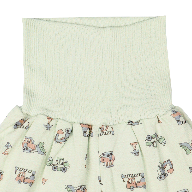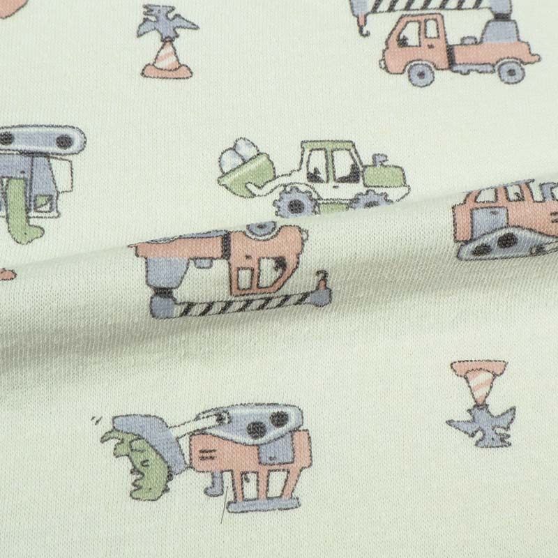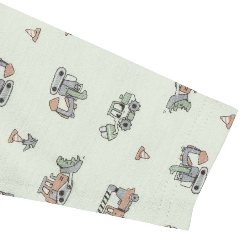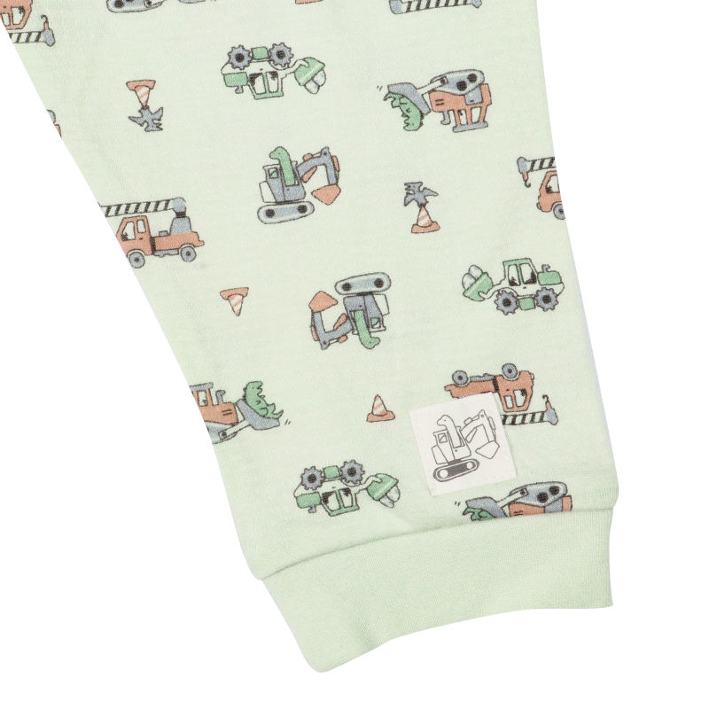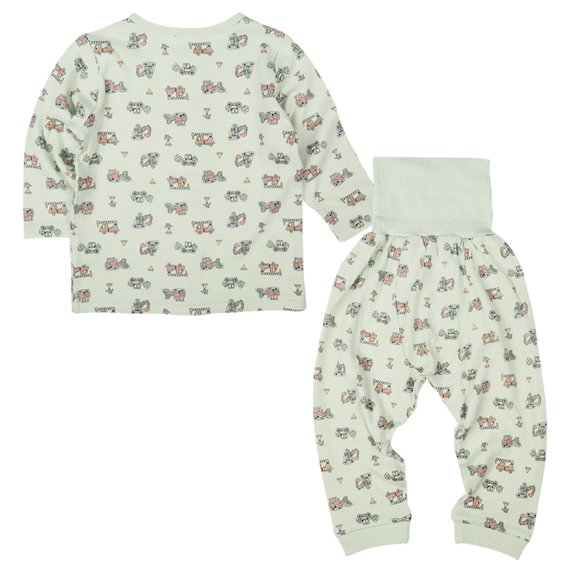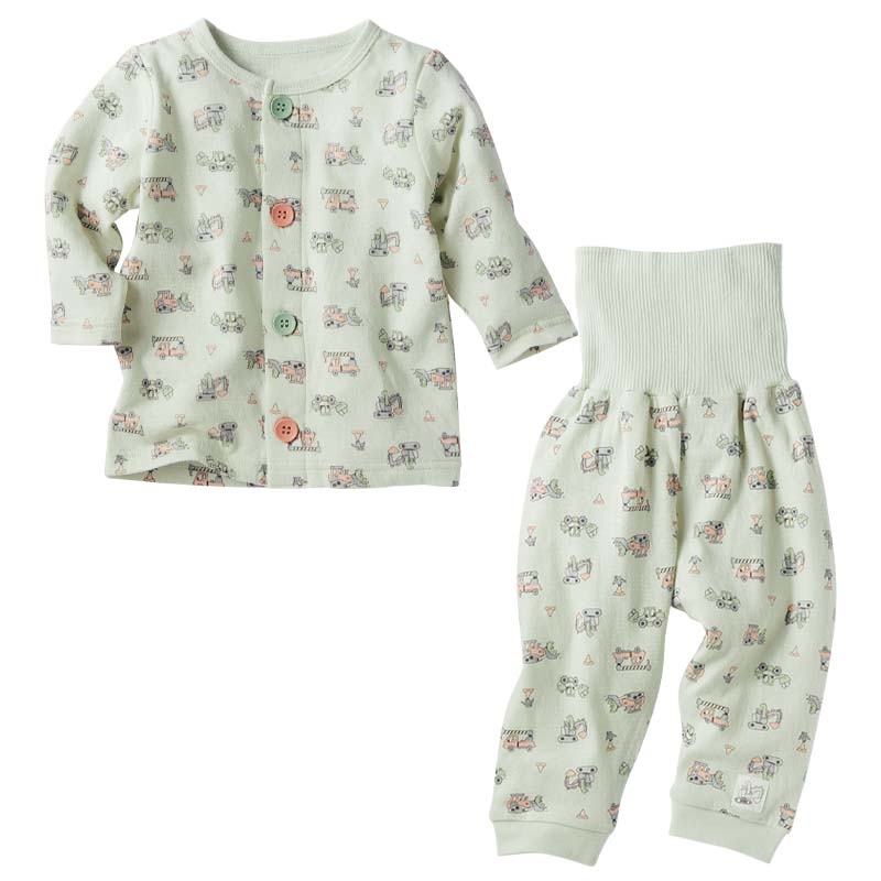 ベビー幼児用、冬向けのお着替え応援パジャマをご紹介致します。 驚くほどなめらかで、肌触り・着心地の良い綿100%の接結素材です。 トップスは、釦の色とホールの色を合わせて掛け違いを防ぎます。 またボトムは、裾部分にワンポイントを入れており、どちらが前が分かるようになっています。 また寝返りを打ってもお腹が出にくい腹巻き付きです。 ペパーミント地に働く車の総柄です。