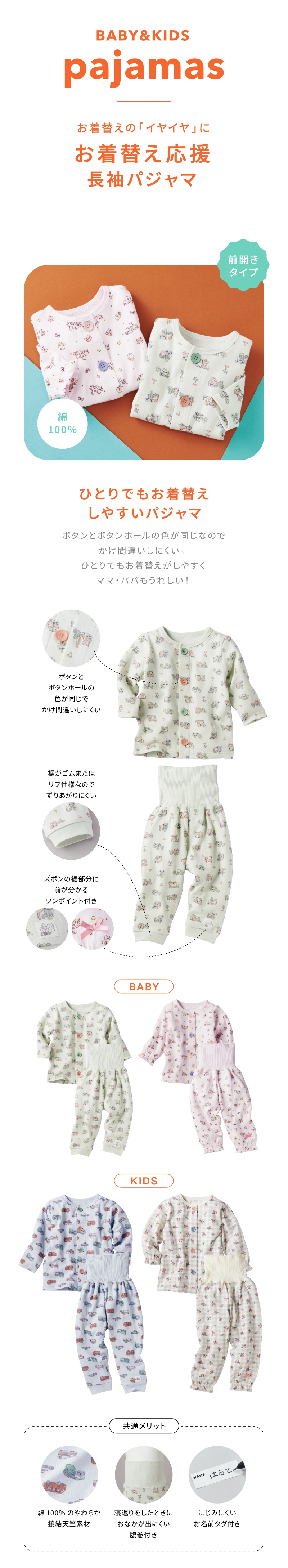 ●素材=本体:綿100%, 附属編地:綿95%、ポリウレタン5% ●サイズ(約・cm)=80(着丈37・身幅29・袖丈25・パンツ丈37) 90(着丈40・身幅31・袖丈28・パンツ丈43) 95(着丈42・身幅32・袖丈30・パンツ丈46.5) ※パンツ丈は腹巻き除く