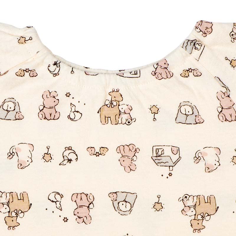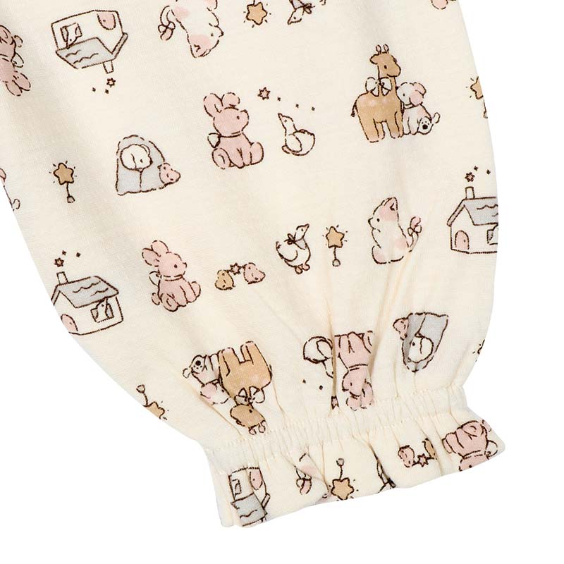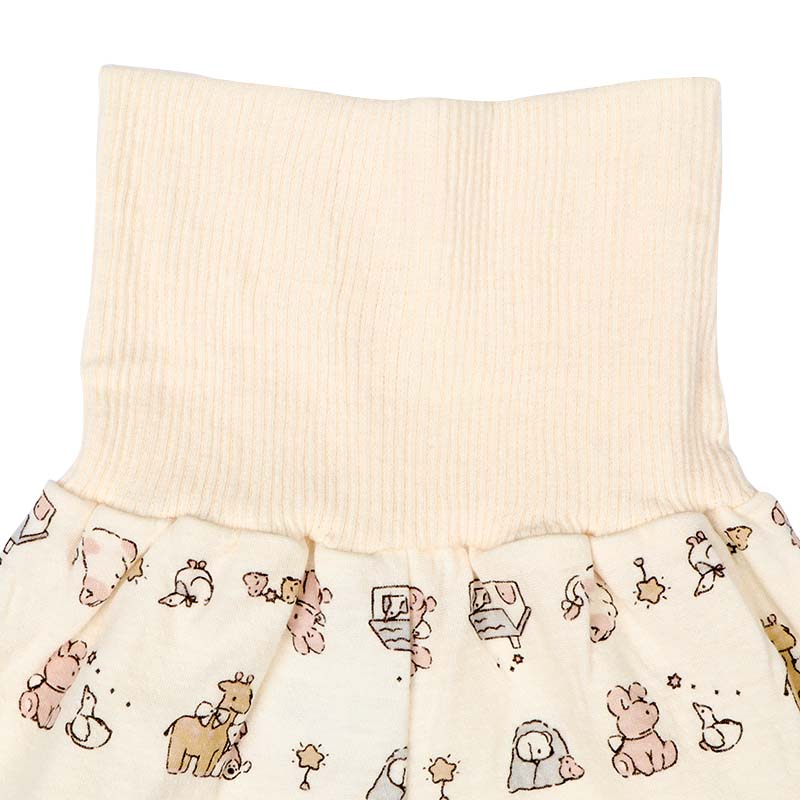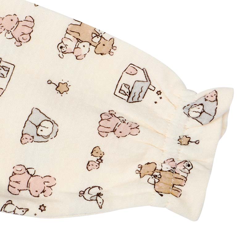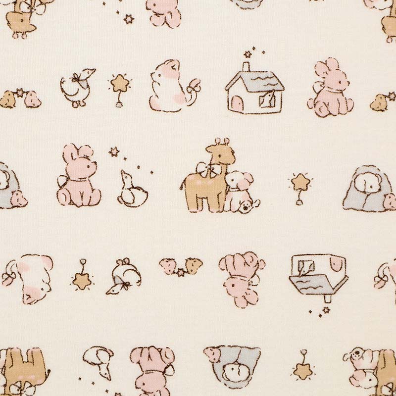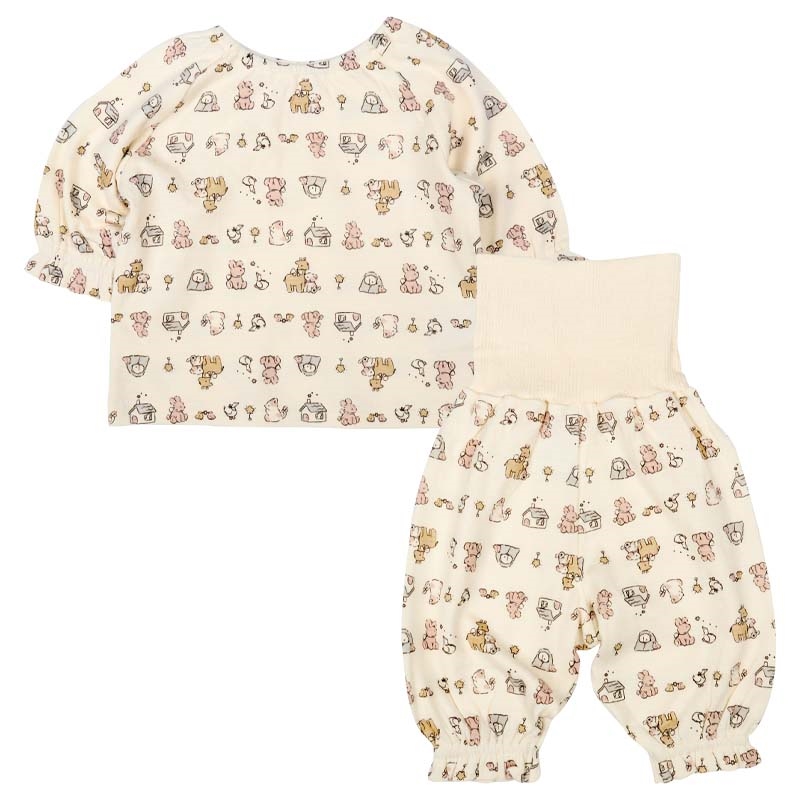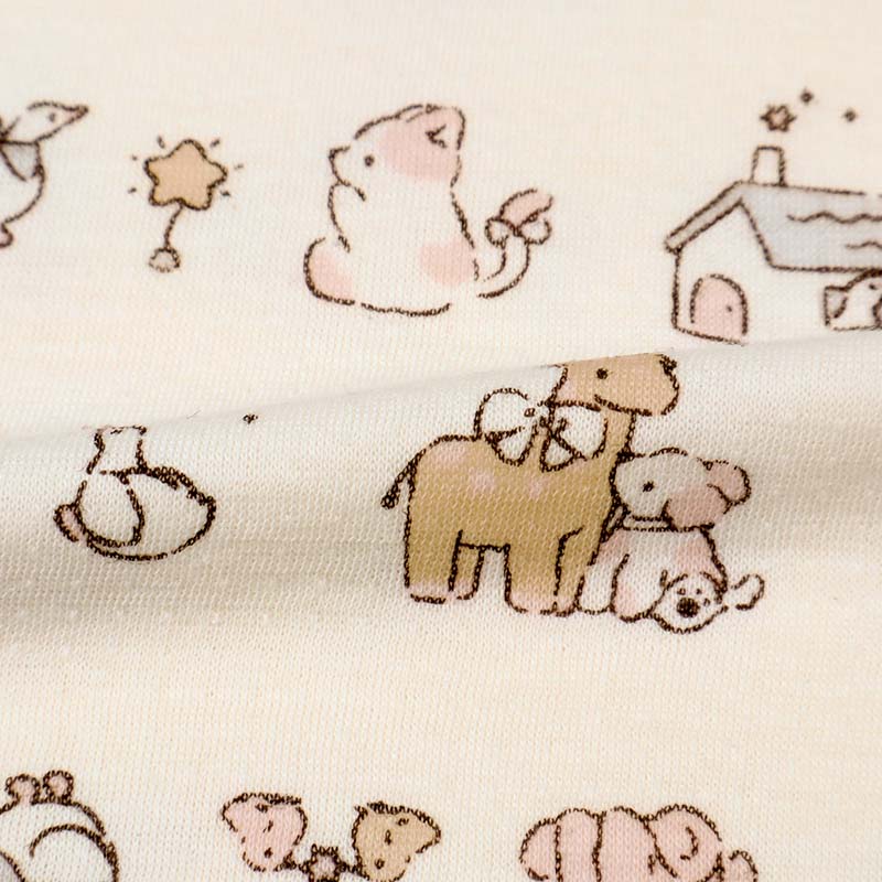 ベビー幼児用、冬向けのお着替え応援パジャマをご紹介致します。 驚くほどなめらかで、肌触り・着心地の良い綿100%の接結素材です。 トップス・ボトムス共に前後ろどちらでも着れる仕様になっており、着せ間違いの心配はありません。 また寝返りを打ってもお腹が出にくい腹巻き付きです。 クリーム地でアニマルの総柄になります。
