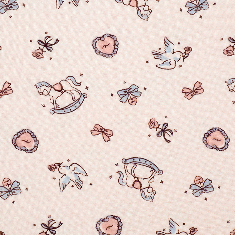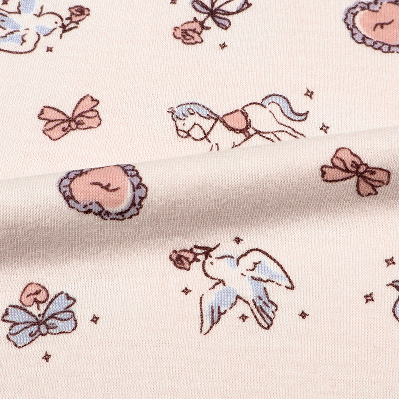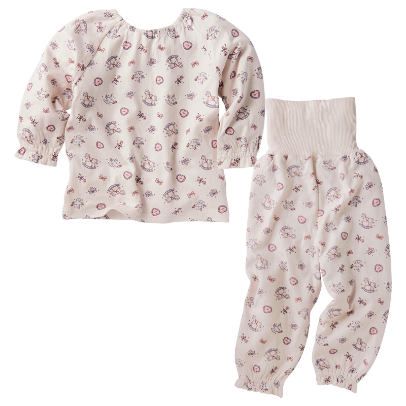 トドラーキッズ用、冬向けのお着替え応援パジャマをご紹介致します。 驚くほどなめらかで、肌触り・着心地の良い綿100%の接結素材です。 トップス・ボトムス共に前後ろどちらでも着れる仕様になっており、着せ間違いの心配はありません。 また寝返りを打ってもお腹が出にくい腹巻き付きです。 ピンク地で木馬の総柄になります。