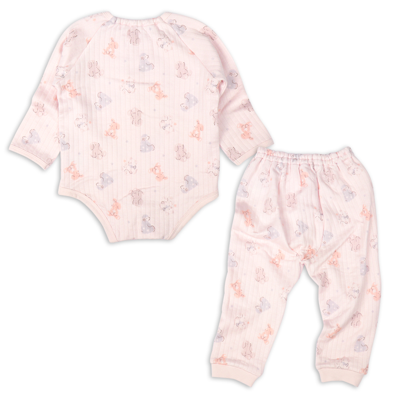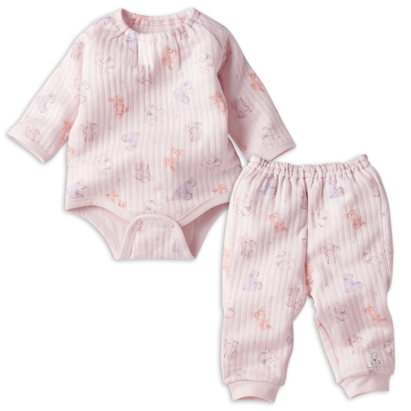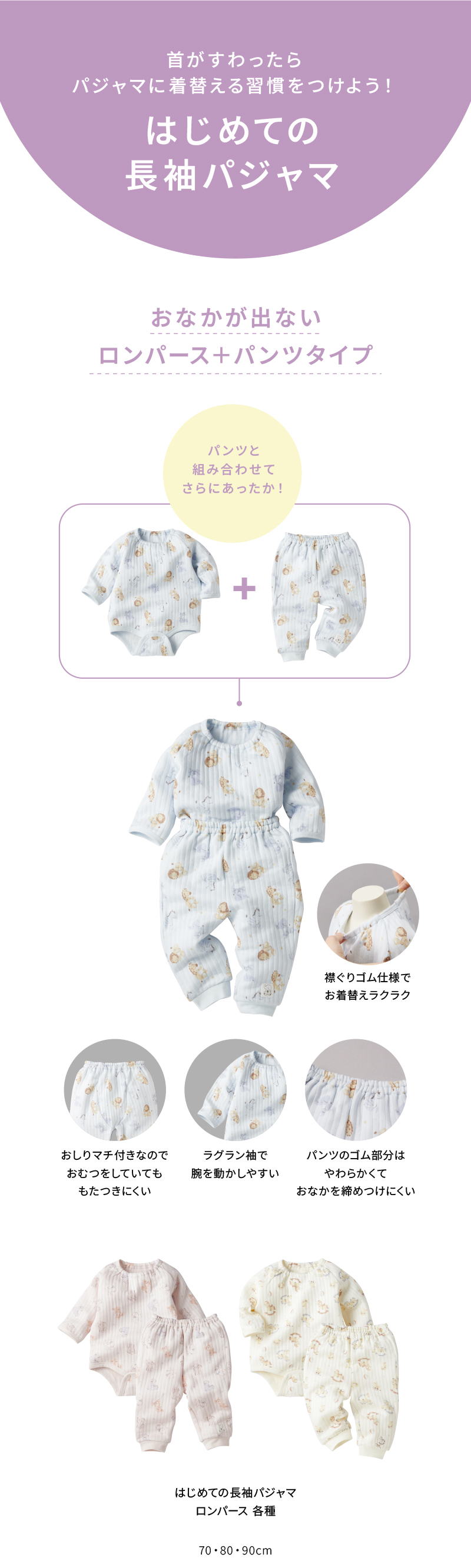 ●素材=本体 表:アクリル60%/レーヨン40%、裏:綿100%、中わた:ポリエステル100% リブ 綿95%/ポリウレタン5% ●サイズ(約・cm)=70(総丈:42.5・身幅:30.5・裄丈:32.5・パンツ丈:34) 80(総丈:45.5・身幅:31.5・裄丈:36.5・パンツ丈:40) 90(総丈:48.5・身幅:32.5・裄丈:40.5・パンツ丈:46)