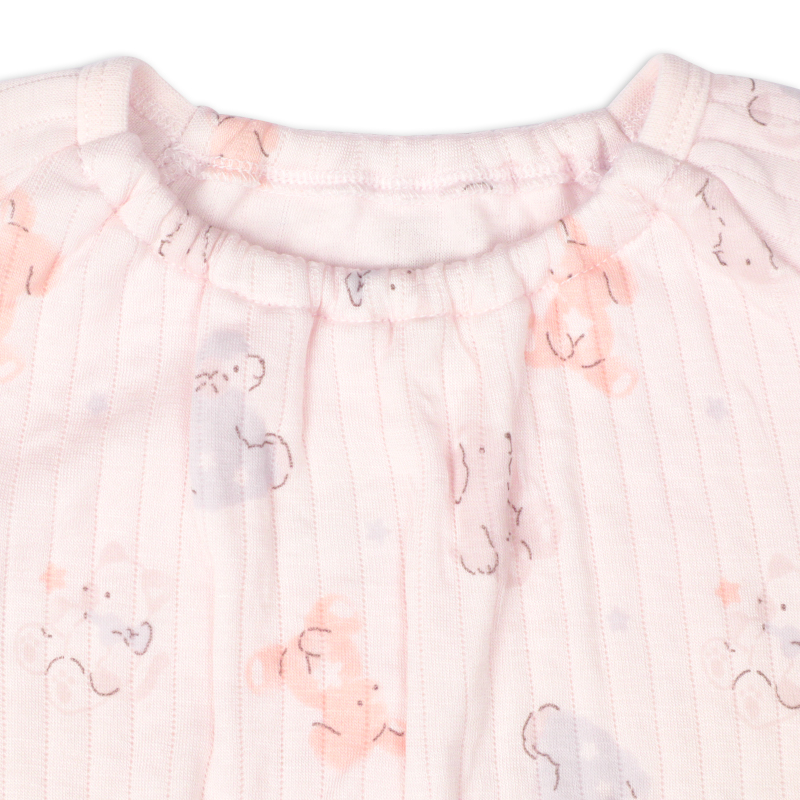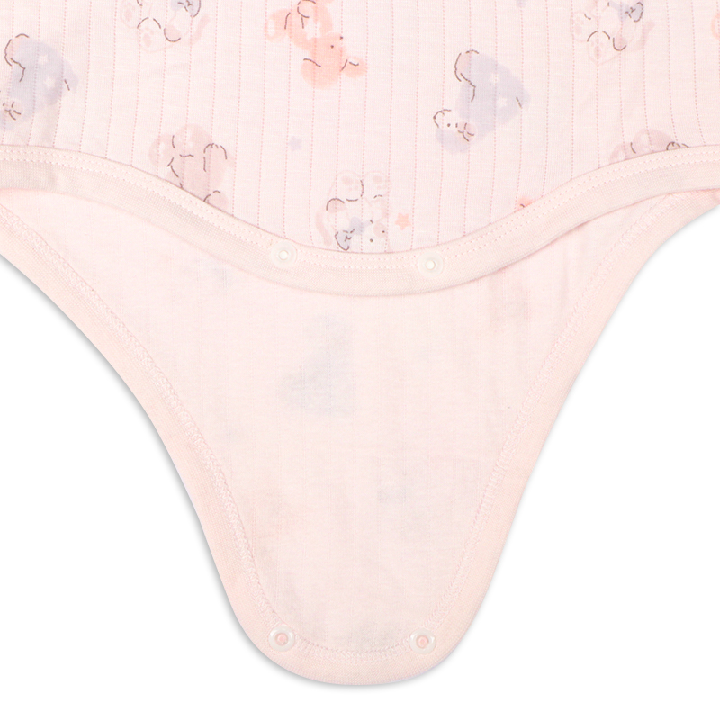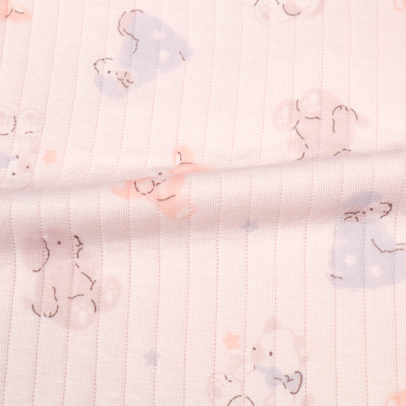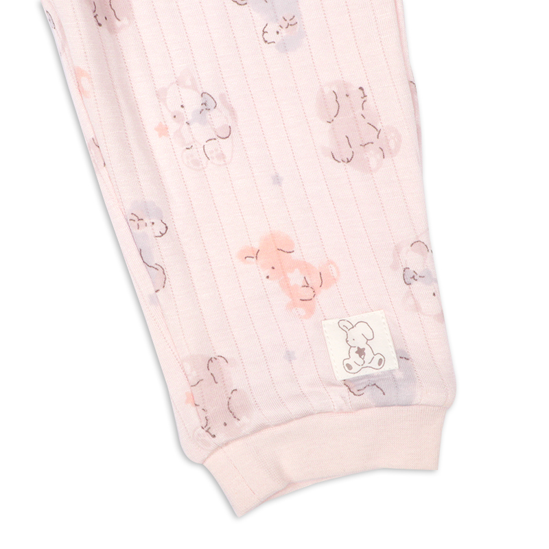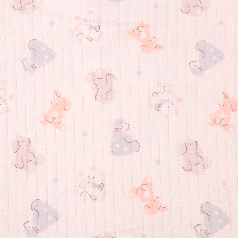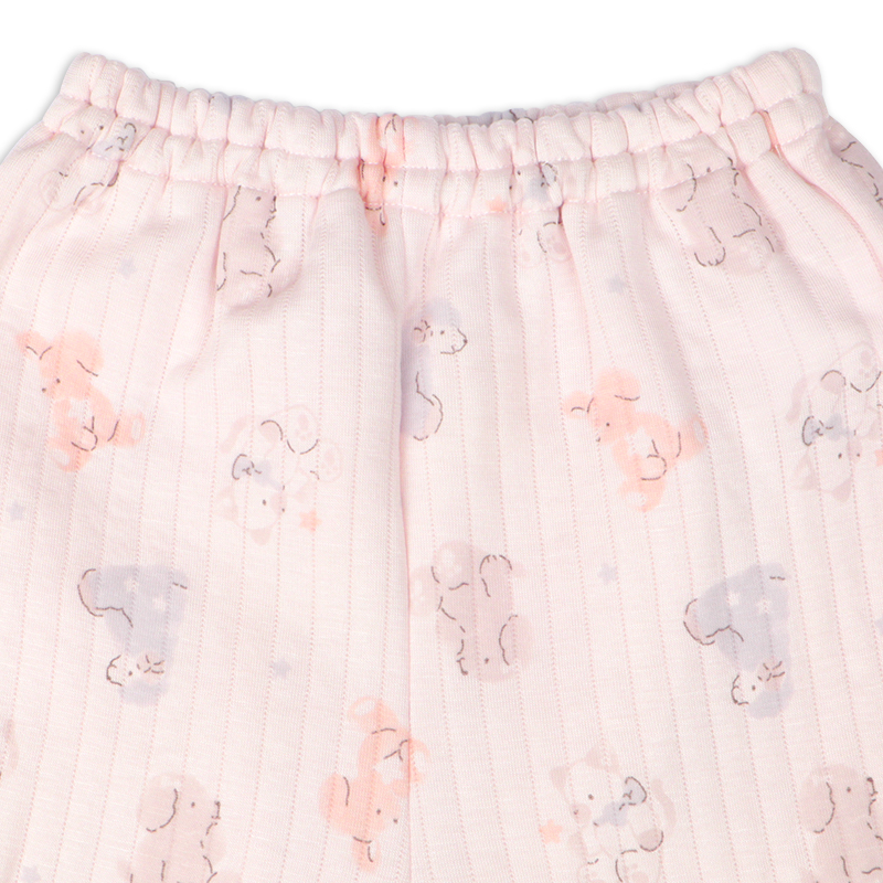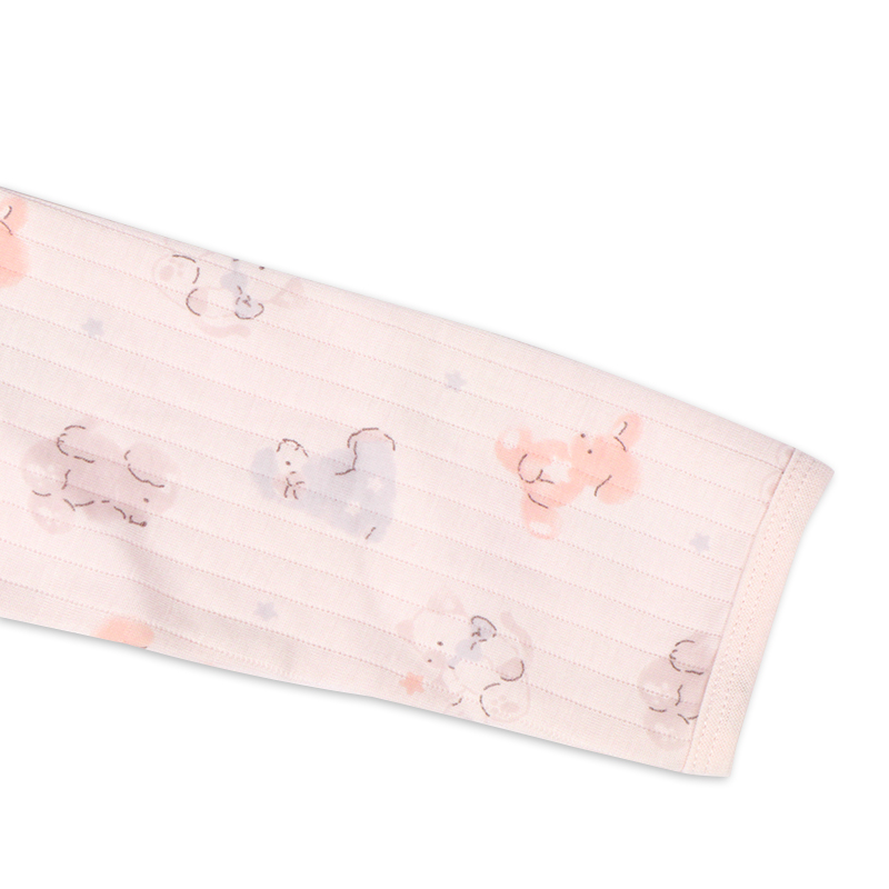 パジャマデビューを迎えるベビー乳幼児向けの、ロンパースパジャマをご紹介致します。 表生地:アクリル/レーヨン 60/40,裏生地:綿 100%,中にポリエステルのわた入りの、 ふわふわで温かな素材を使用しています。(肌に当たる部分は綿100%になります。) 衿ぐりゴムが伸びるから着脱がらくなことに加えて、パンツにマチが付けているのでおしり周りはゆったり設計になっています。 ピンク地でうさぎさんの総柄モチーフです。