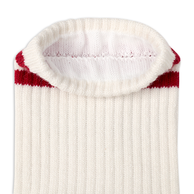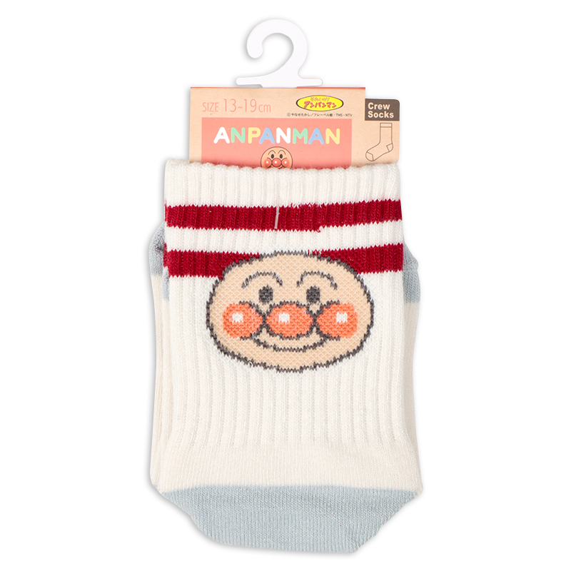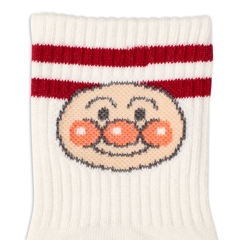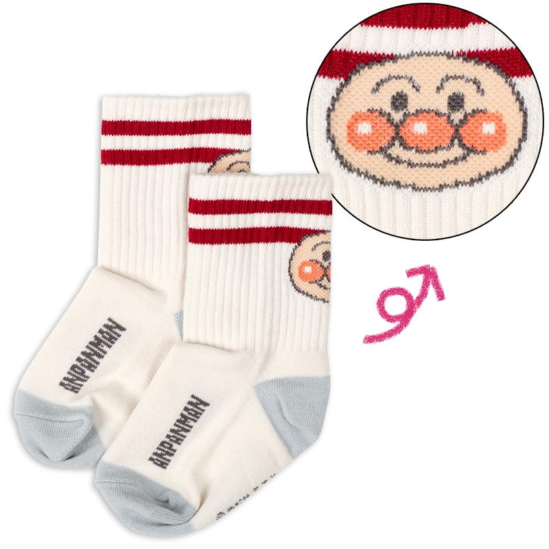 アンパンマンとバイキンマンの顔を編み柄で表現しております。靴下の履き口部分にボーダーを編み込みで表現しており スポーティーなイメージのキッズ用の靴下です。それぞれのキャラクターのイメージカラーをボーダー色に使用しております。