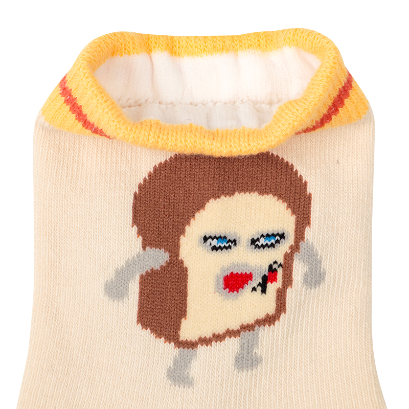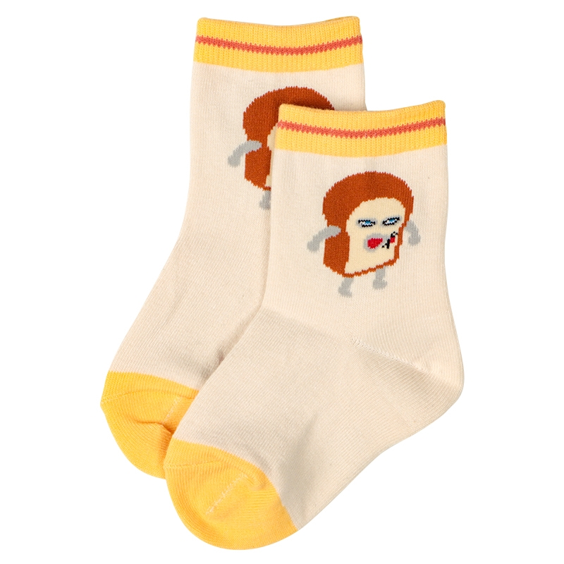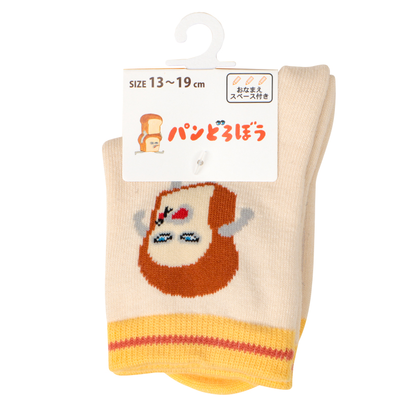 大人から子供まで人気のパンどろぼうの靴下です。キャラクターの全身を中央に表現してベースカラーはベージュ色とネイビー色があります。 男の子、女の子兼用で履いて頂けるキャラクターをシンプルに表現した靴下です。