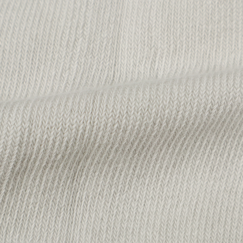 主原料に表糸綿100%使用。丸編みの構造上、伸縮性を出す為、身生地の裏糸にはポリエステル、ポリウレタンを使用しており、肌触りも心地良く快適な着用感です。