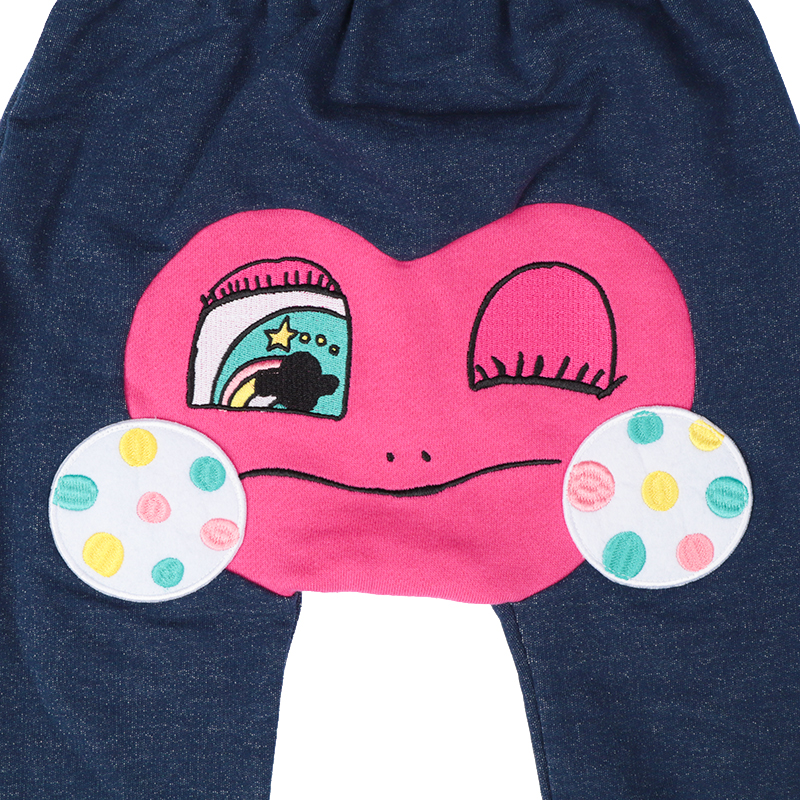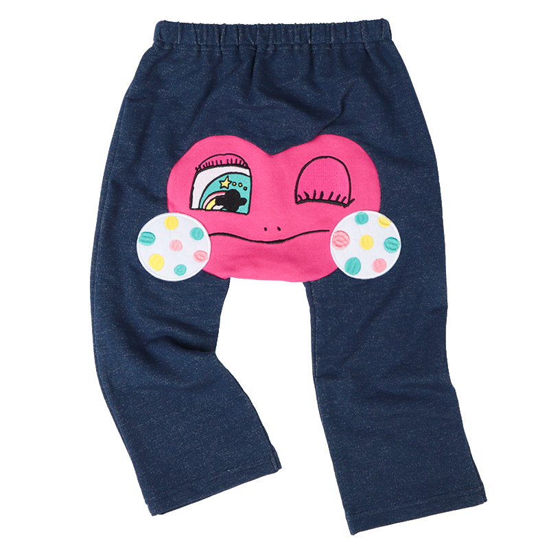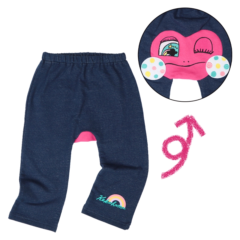 ●素材=[本体]綿95% ポリウレタン5% [別布部分]綿100% [アップリケ部分]ポリエステル100% ●原産国=中国 ●サイズ(約・cm)= 80(股上19.5・股下21・腰まわり64・ウエスト上がり40) 90(股上20.5・股下24.5・腰まわり66・ウエスト上がり42) 100(股上22.5・股下30.5・腰まわり70・ウエスト上がり46)
