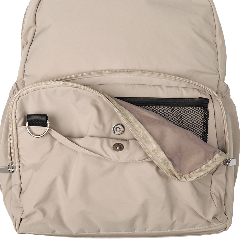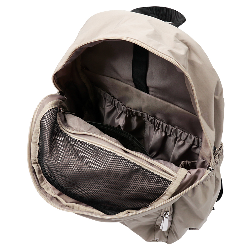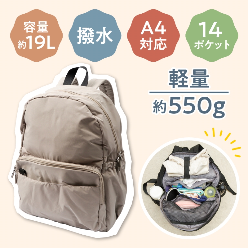 軽い、背負いやすいリュック ポケットは全部で14か所 ・内部上辺着替えなどをくくる収納ゴム ・抱っこ紐リュックを降ろせるバックル ・キャリーケースに通せるベルト付き ・A4サイズがすっぽり入る ・自立する仕様 ・撥水生地 ・容量約19リットル