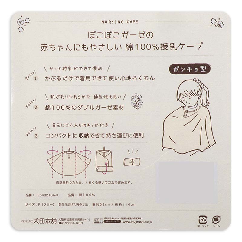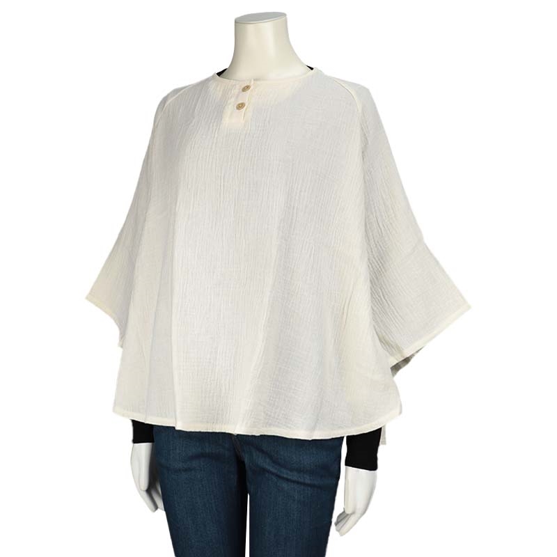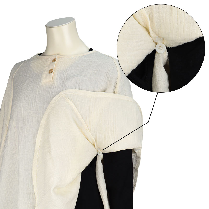 授乳期ママの便利グッズ。 かぶるだけで着用出来て、使い心地らくちん。 綿100%のぽこぽこガーゼ素材で赤ちゃんにもやさしい。 首元にゴム入りの輪っか付き。コンパクトに収納出来て、持ち運びに便利。 胸元のボタンを外せば、授乳する赤ちゃんの様子がうかがえます 脇のボタンを留めればトップスとして着用出来、授乳時はボタンを外してゆったり授乳できます。 首元のゴムでコンパクトに収納出来ます。