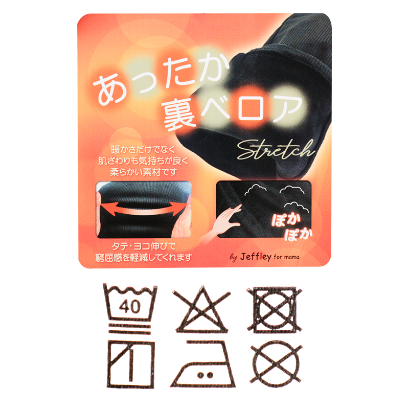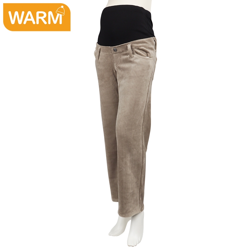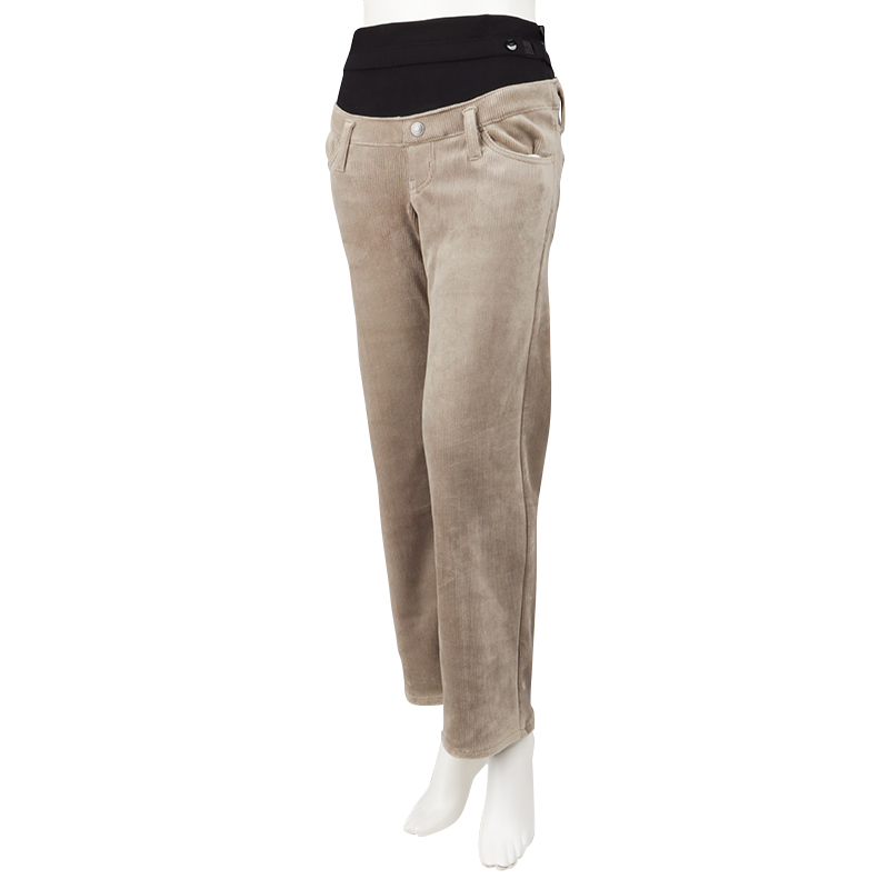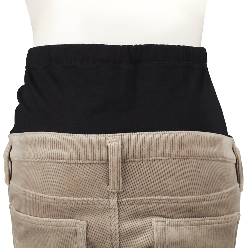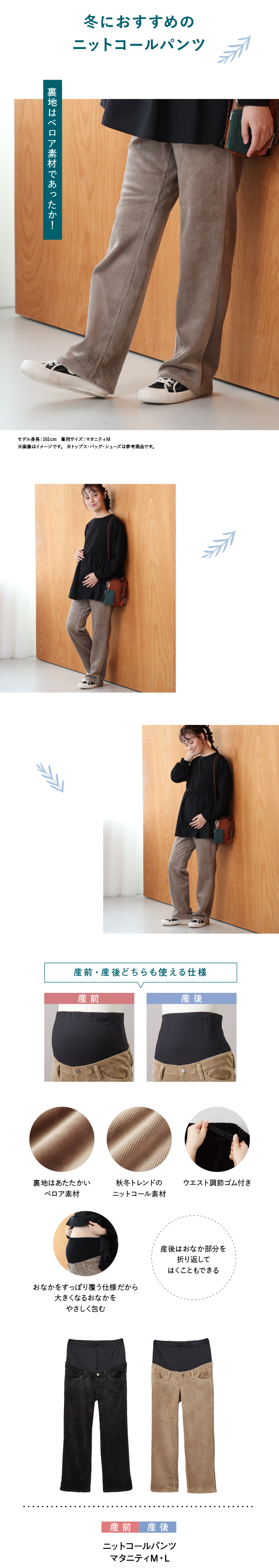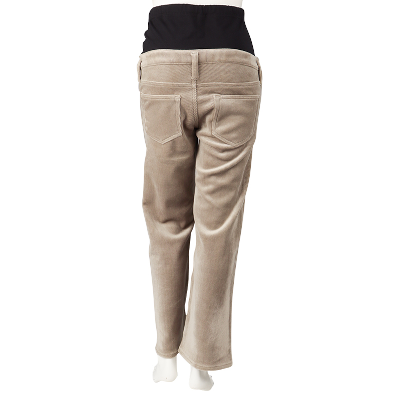穿いて暖かいニットコール裏ベロアパンツです。 暖かみのある心地よいベロア素材を使用して穿いて暖かで楽チンです。 おなか部分は伸縮性の良いカットソー素材を使用し、お腹周りを締め付けず心地よく穿けます。 おなか部分のカットソー素材を折り返して産後も穿くことができます。
