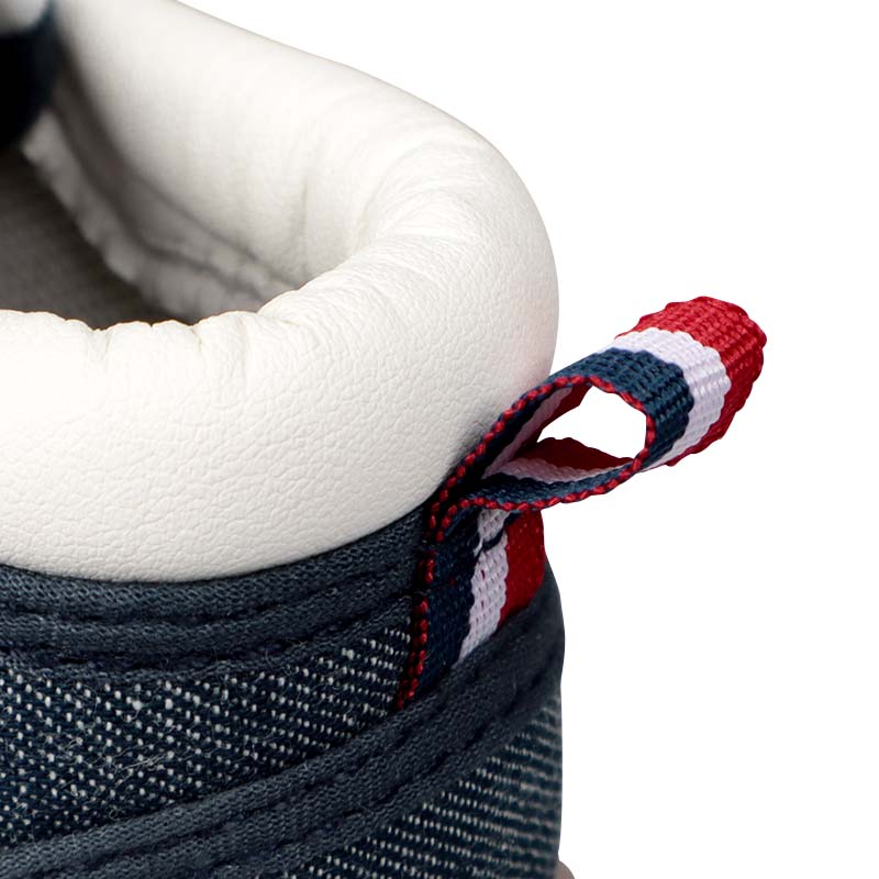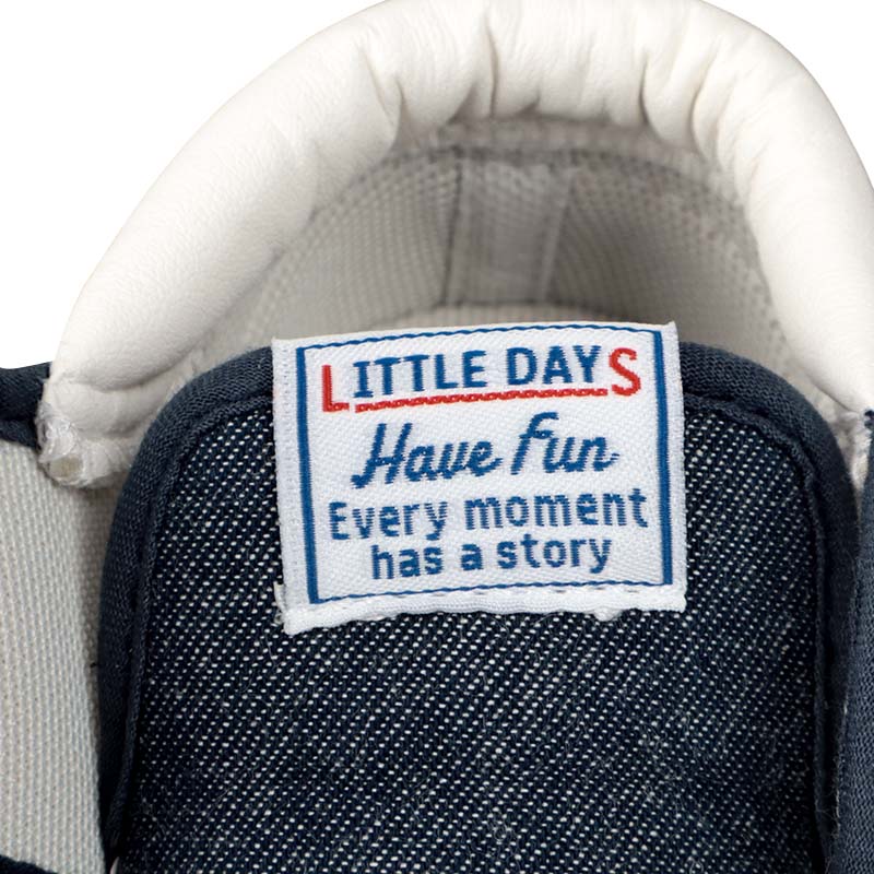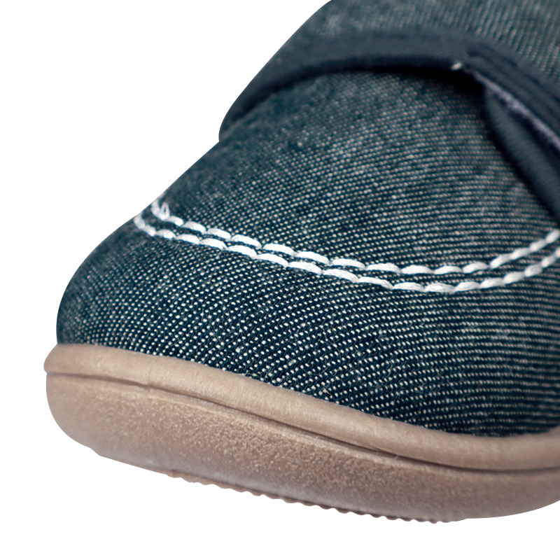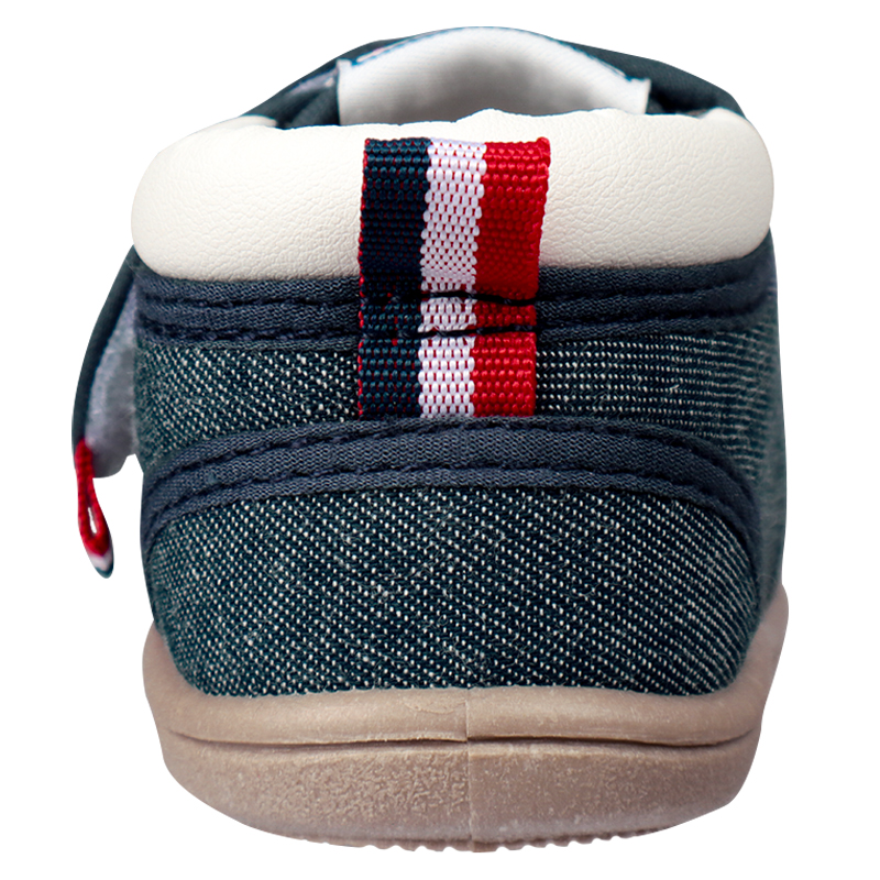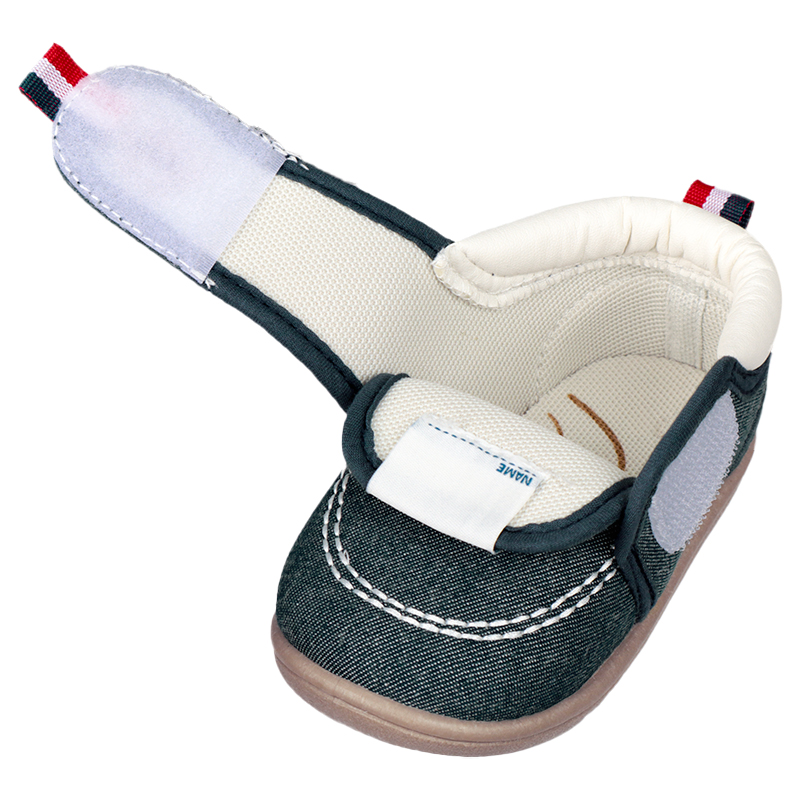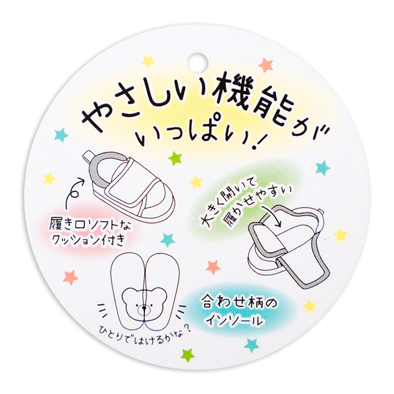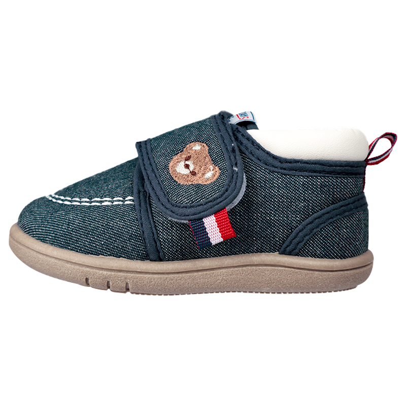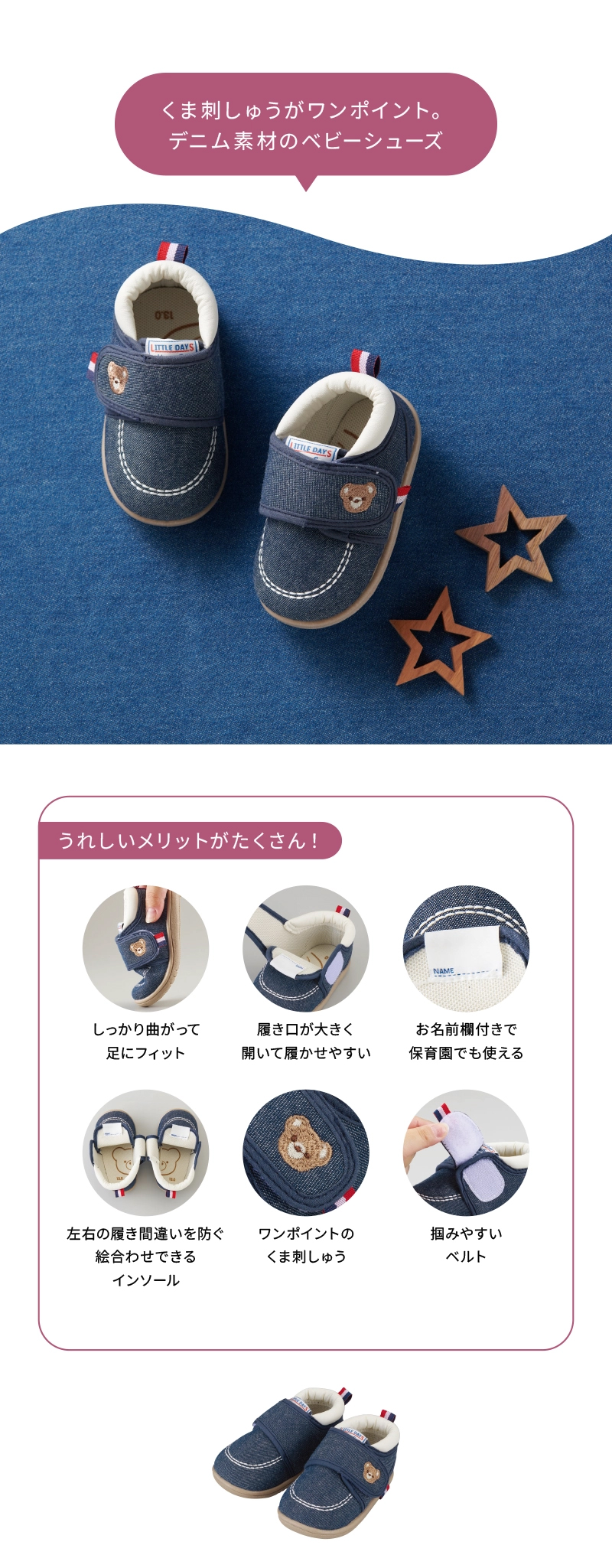 履き口のリブがポイント 履き口が大きく開いて履かせ易いリーズナブルなシューズ。 太いベルトにキュートなクマの刺繍がポイント コーディネートしやすいデニム素材 中敷はクマの顔が合体するプリントで左右が分かる。履き間違いを防止します