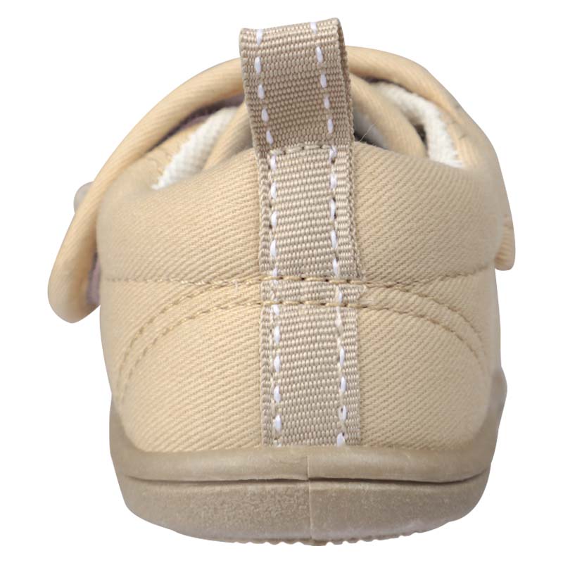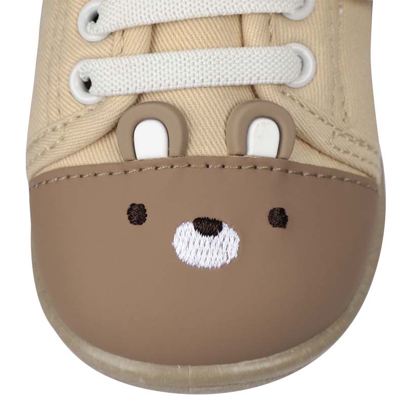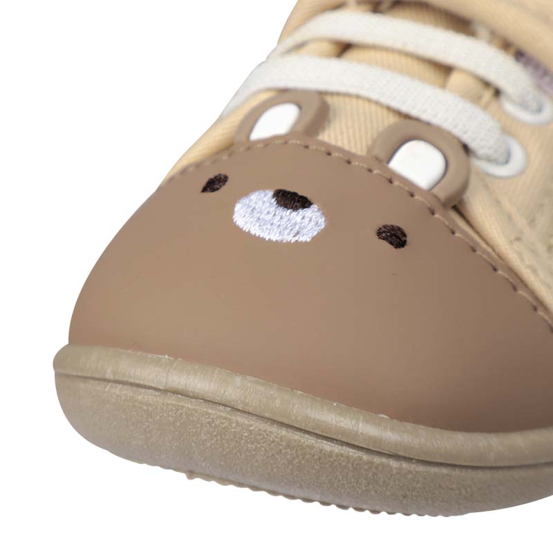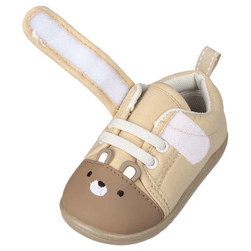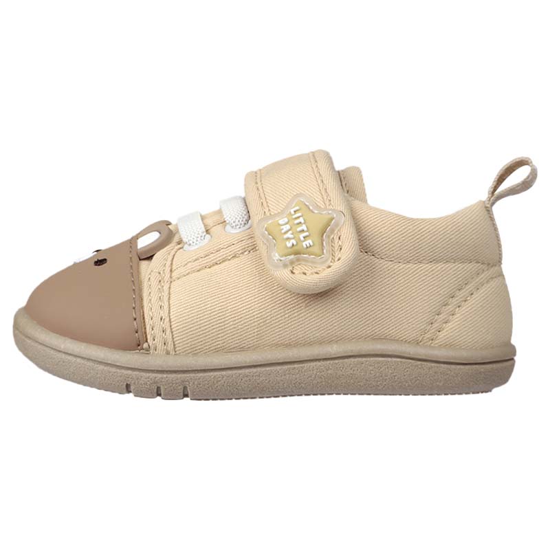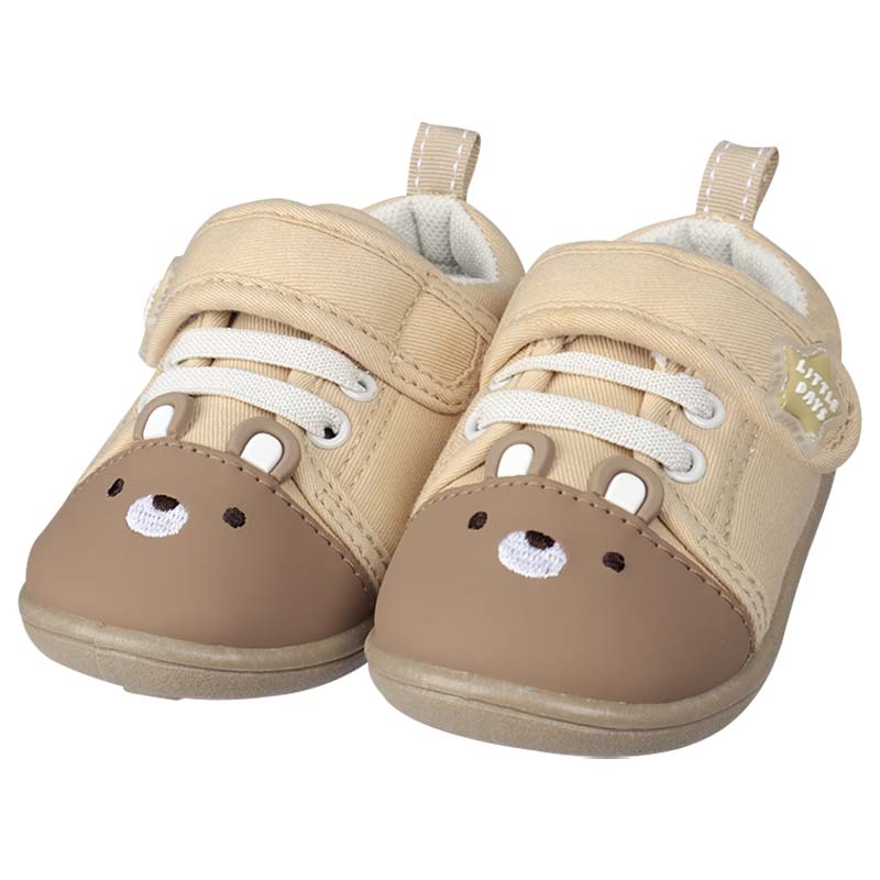 軽くて歩きやすく・履き口が面ファスナータイプの履かせ易いシューズ 内側メッシュで柔らかい素材 軽くて歩きやすく、お出かけ時におすすめ。 シックなベースカラーにクマ ウサギの顔の刺繍と立体的な耳 ¥1580とリーズナブル