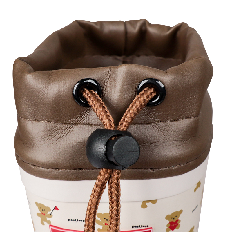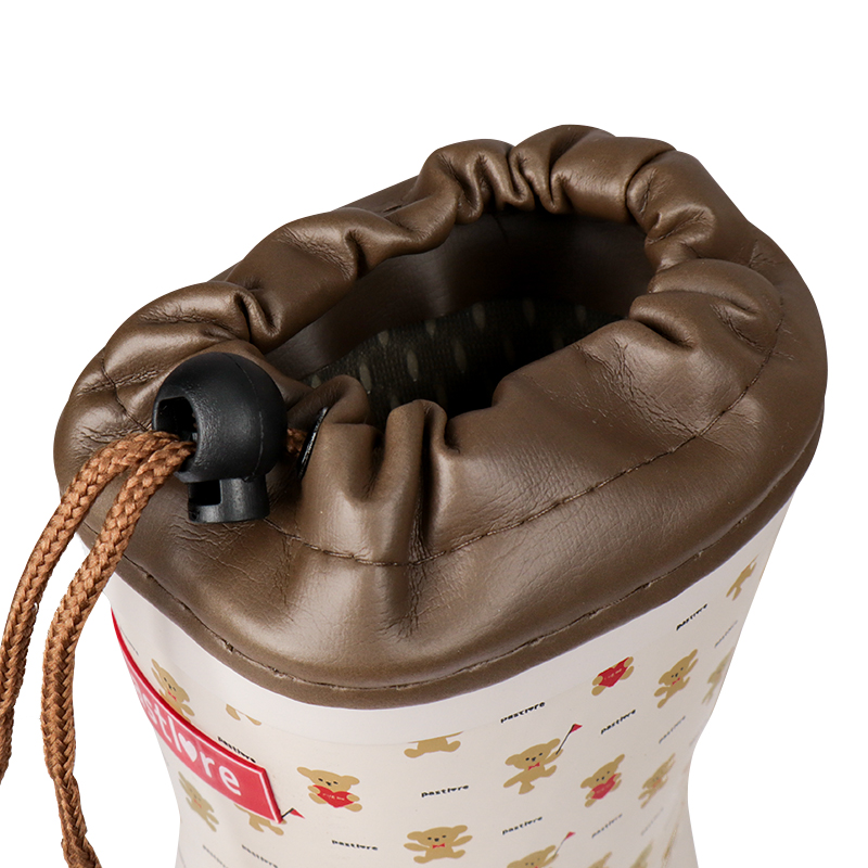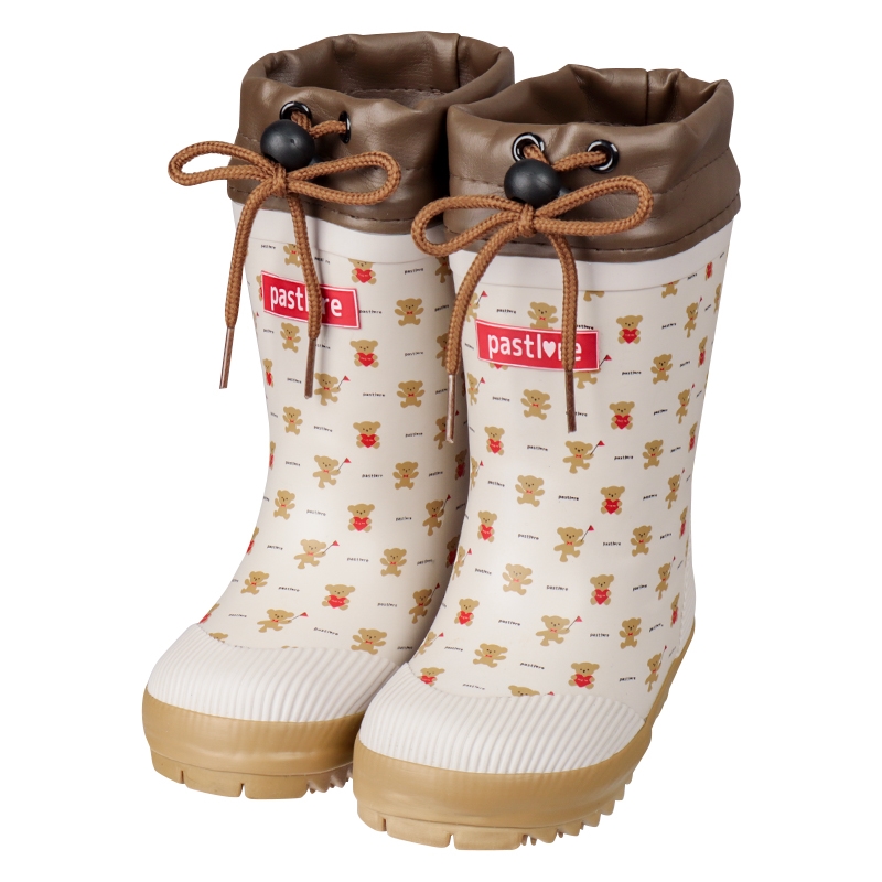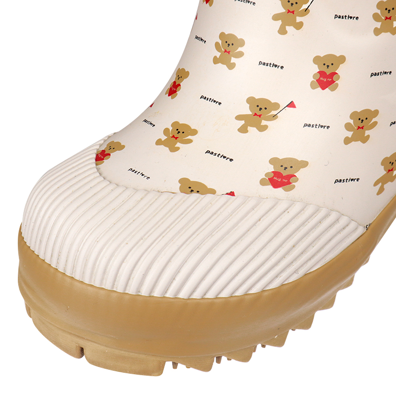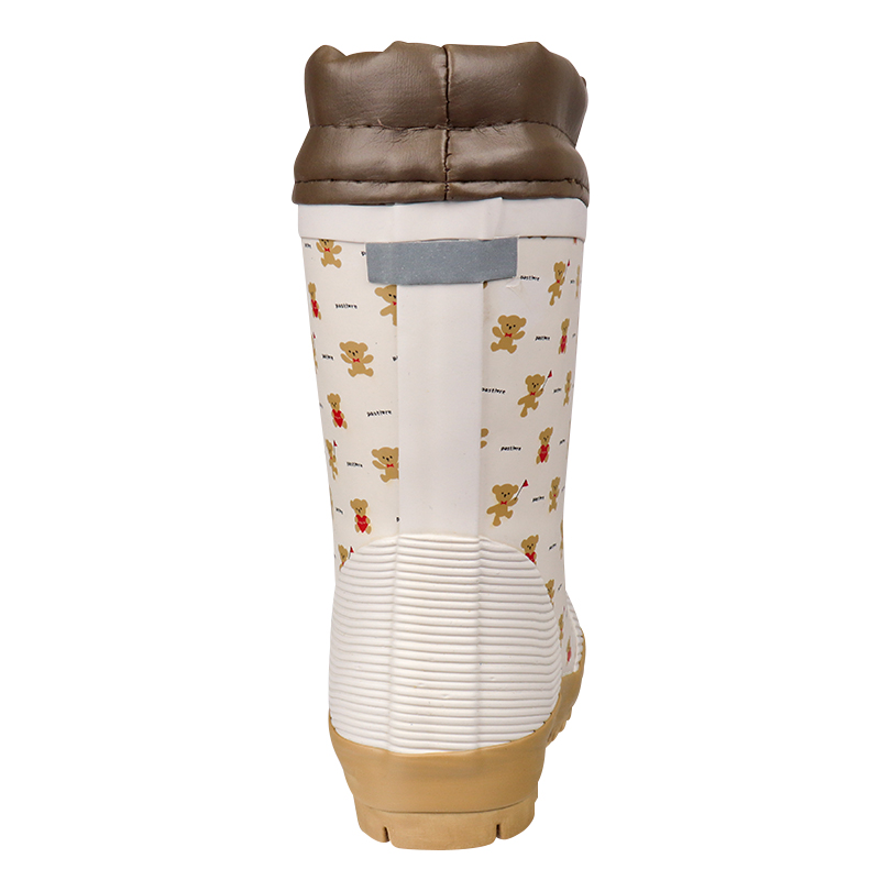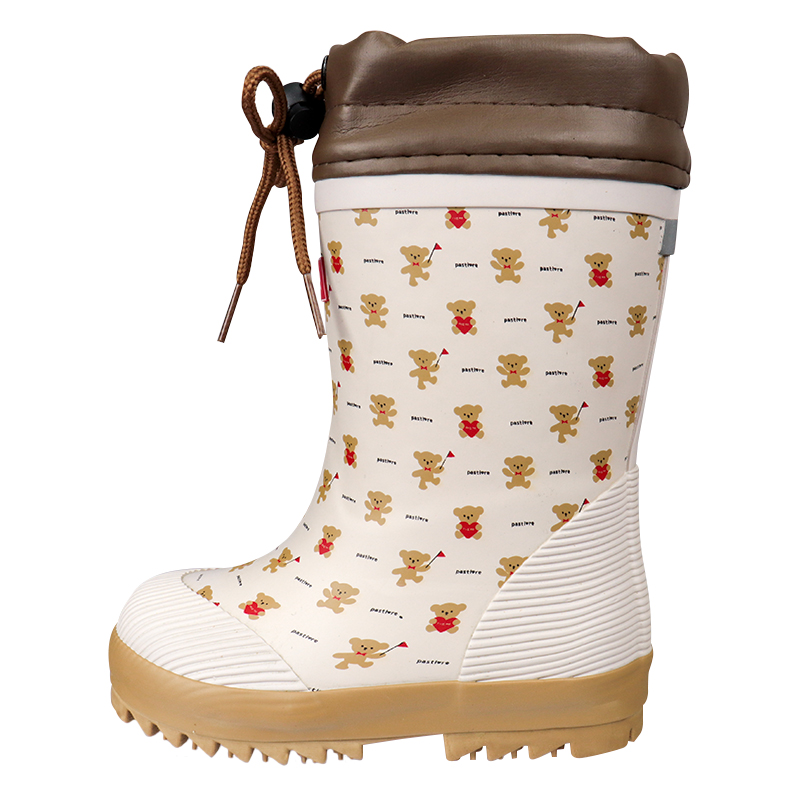 雨の日も楽しみになる、乗り物とクマの総柄デザインがかわいいレインブーツ 履き口のドローコードでフィット感を調節する事ができ、お子様でも脱ぎ履きがスムーズな設計 後部に反射板を使用しているのも嬉しいポイント