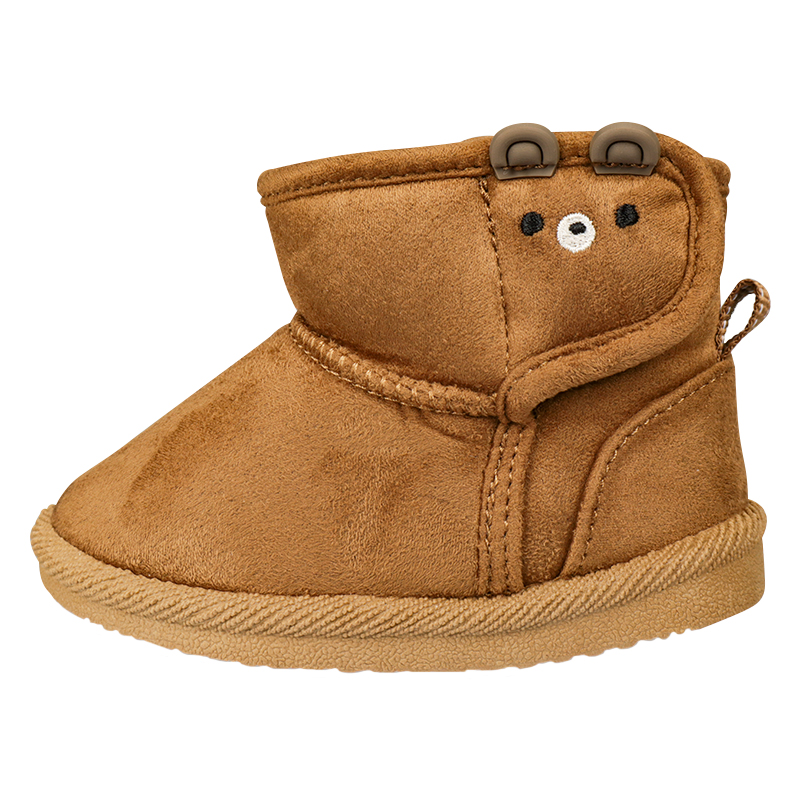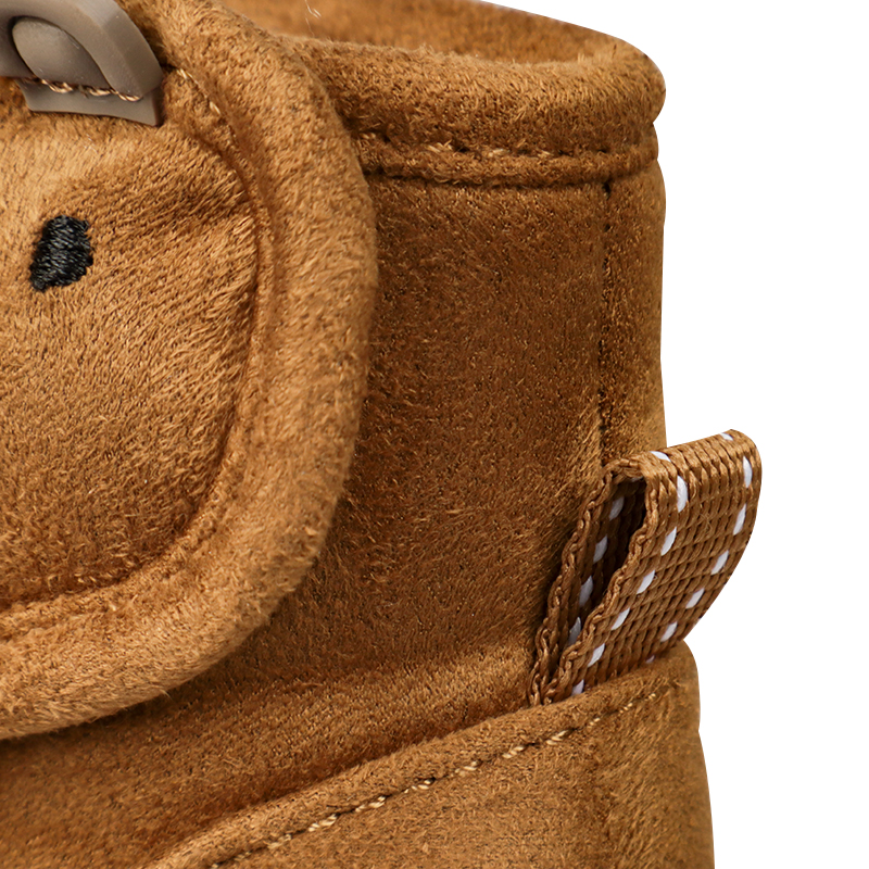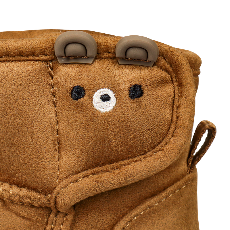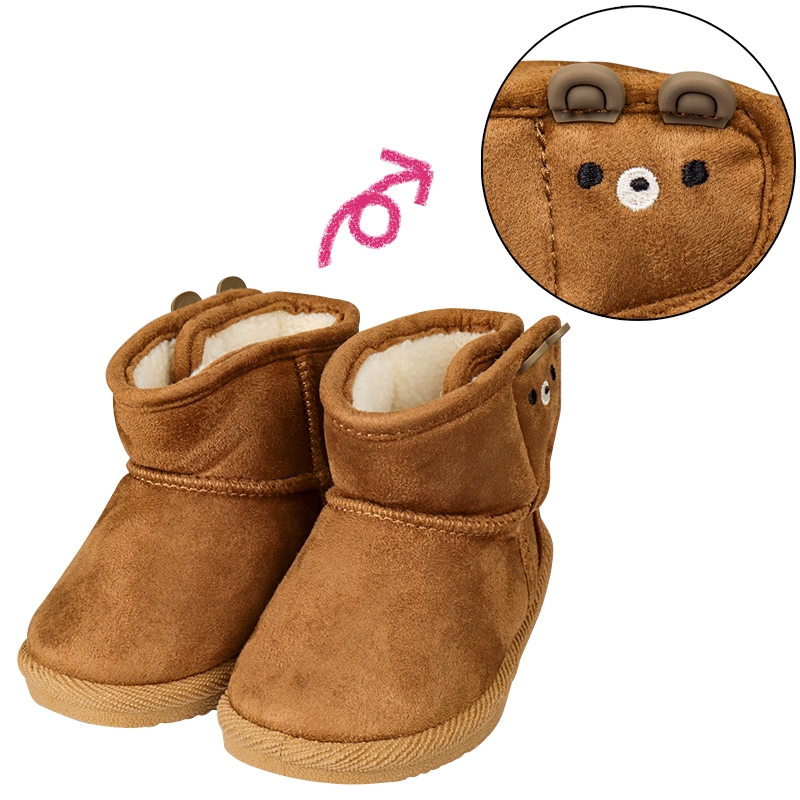 軽くて歩きやすく・履き口が面ファスナータイプの履かせ易いブーツ 履き口にボア仕様で履かせ易いリーズナブルなブーツ。 合わせやすいカラー展開ブラウン・ブラック 履き口の部位(外側)に可愛いクマの刺繍と合皮耳モチーフ付き